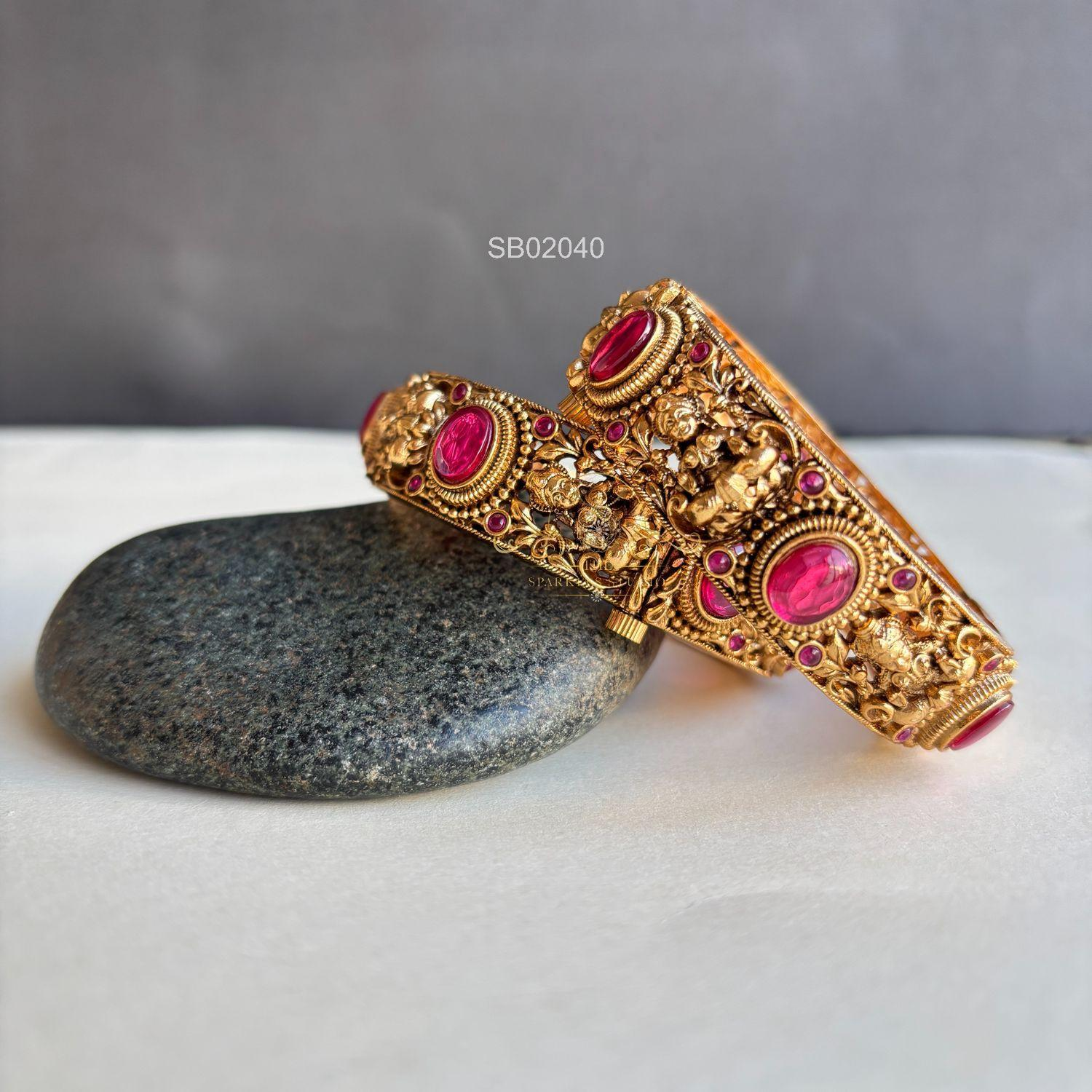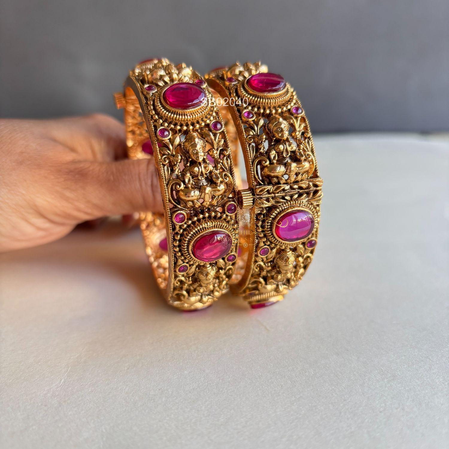 Graceful Lakshmi antique bangles featuring intricate temple-inspired detailing and traditional craftsmanship. Perfect for weddings and festive occasions, they add divine elegance, heritage charm, and timeless gold beauty to every celebration look.