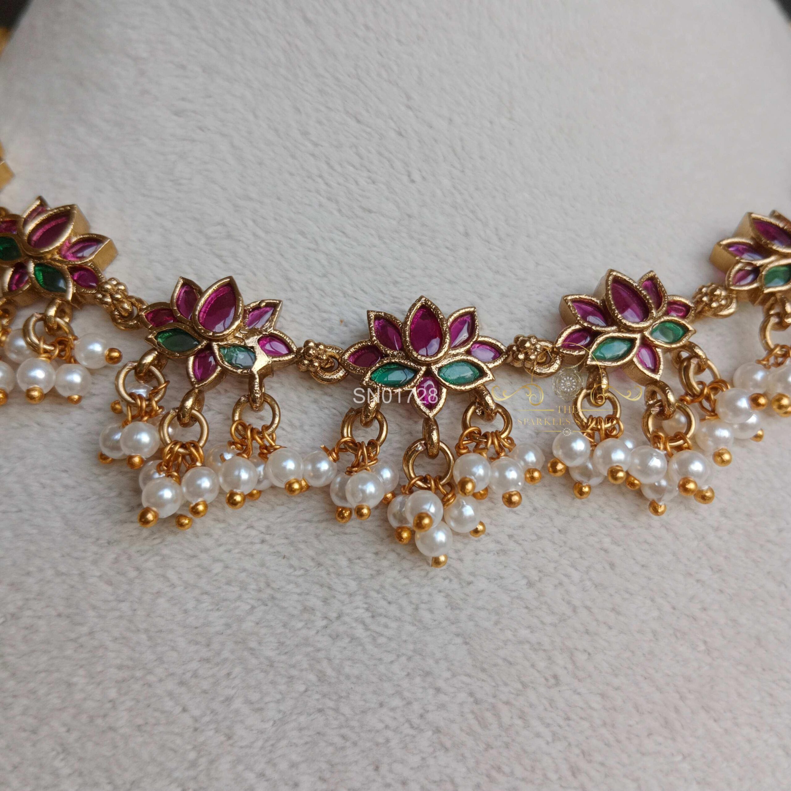 This Lotus Guttapusalu Necklace showcases timeless beauty with delicate lotus motifs, lustrous pearls, and shimmering stones. A perfect pick for weddings and festive celebrations, it brings grace and traditional charm to every bridal ensemble.