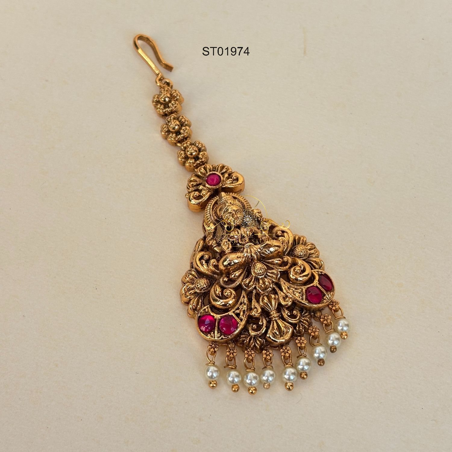 Maang tikka with pearl drops featuring elegant detailing, soft lustrous pearls, and a classic gold finish—perfect for bridal looks, festive styling, and adding timeless charm to traditional ensembles.