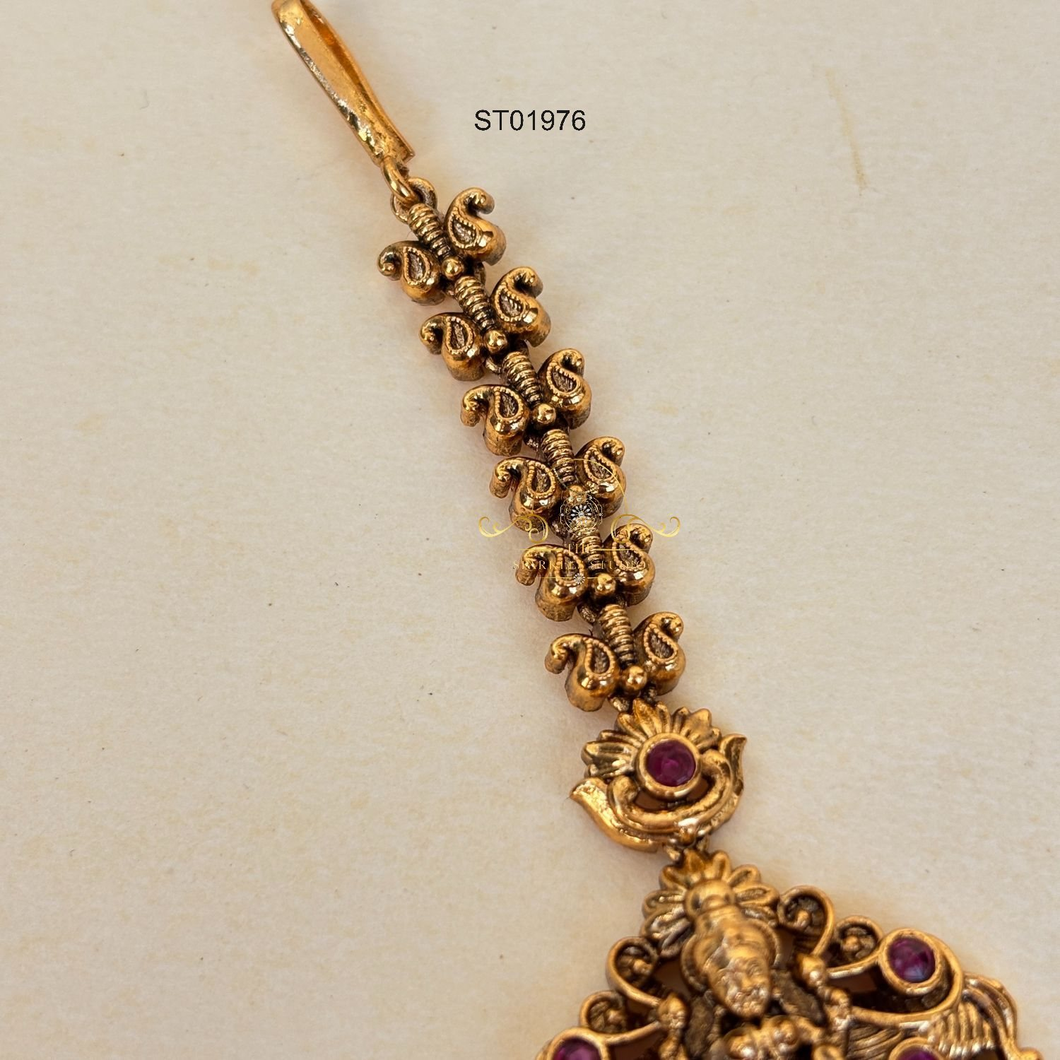 Mango Goddess Lakshmi maang tikka featuring classic paisley motifs, divine Lakshmi detailing, and an antique gold finish—perfect for bridal looks, festive occasions, and timeless South Indian elegance.