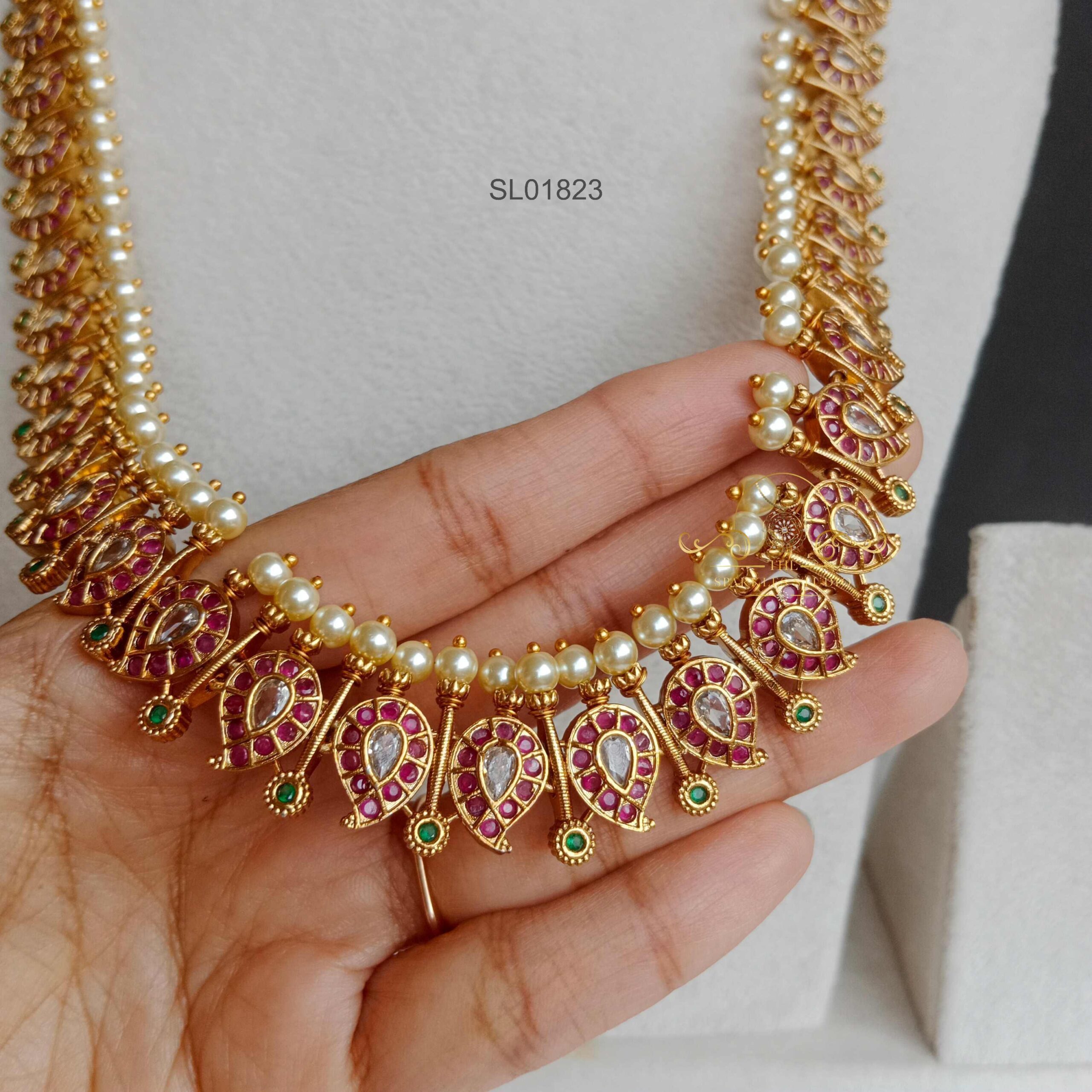 This stunning Mango Kemp Stone Long Necklace dazzles with vibrant red kemp stones set in intricate gold-tone detailing, perfect for traditional Indian outfits, adding elegance and a timeless festive charm.