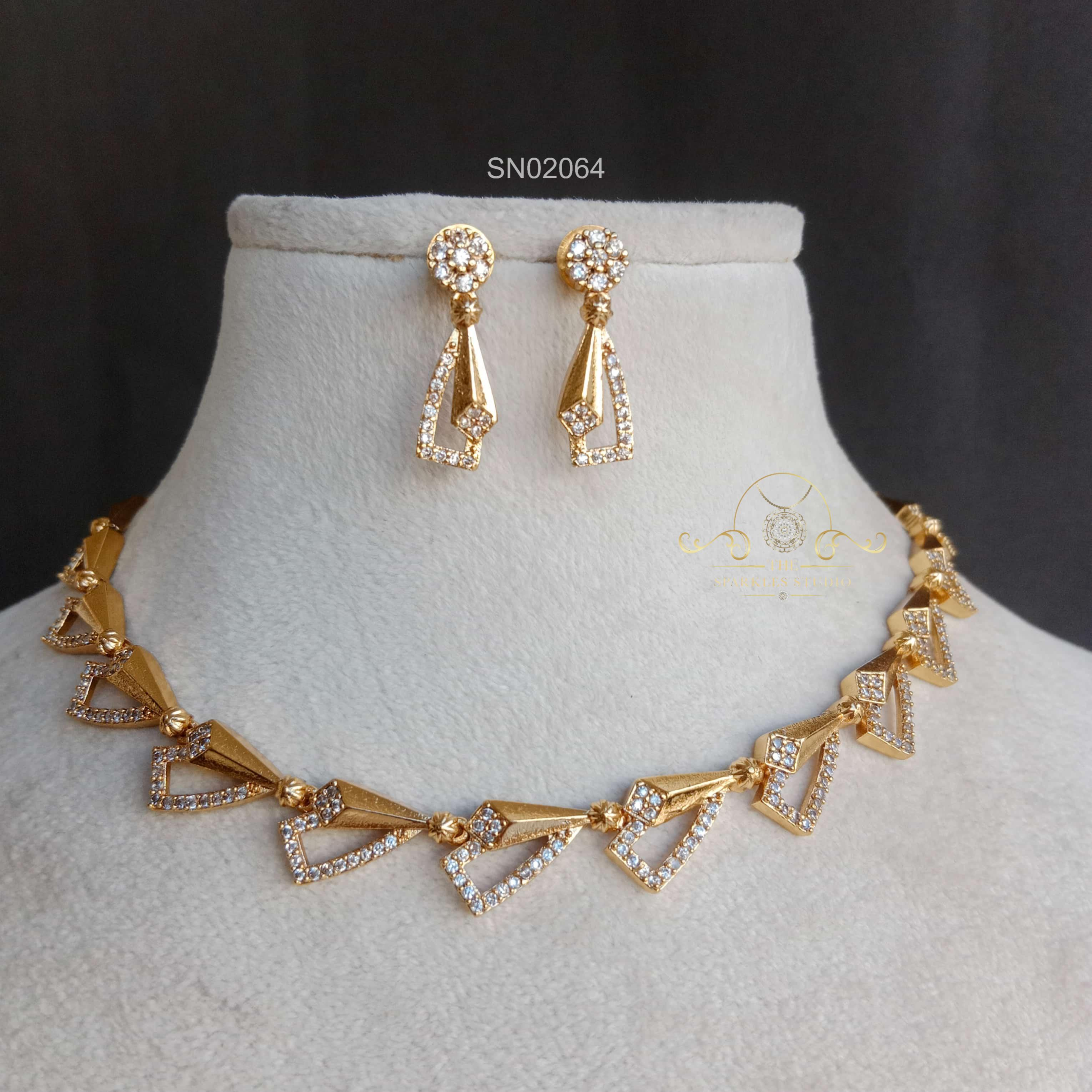 Modern AD Necklace crafted with dazzling American diamonds and sleek contemporary design. Its refined sparkle and elegant finish make it perfect for parties, receptions, and stylish festive looks with effortless glamour.