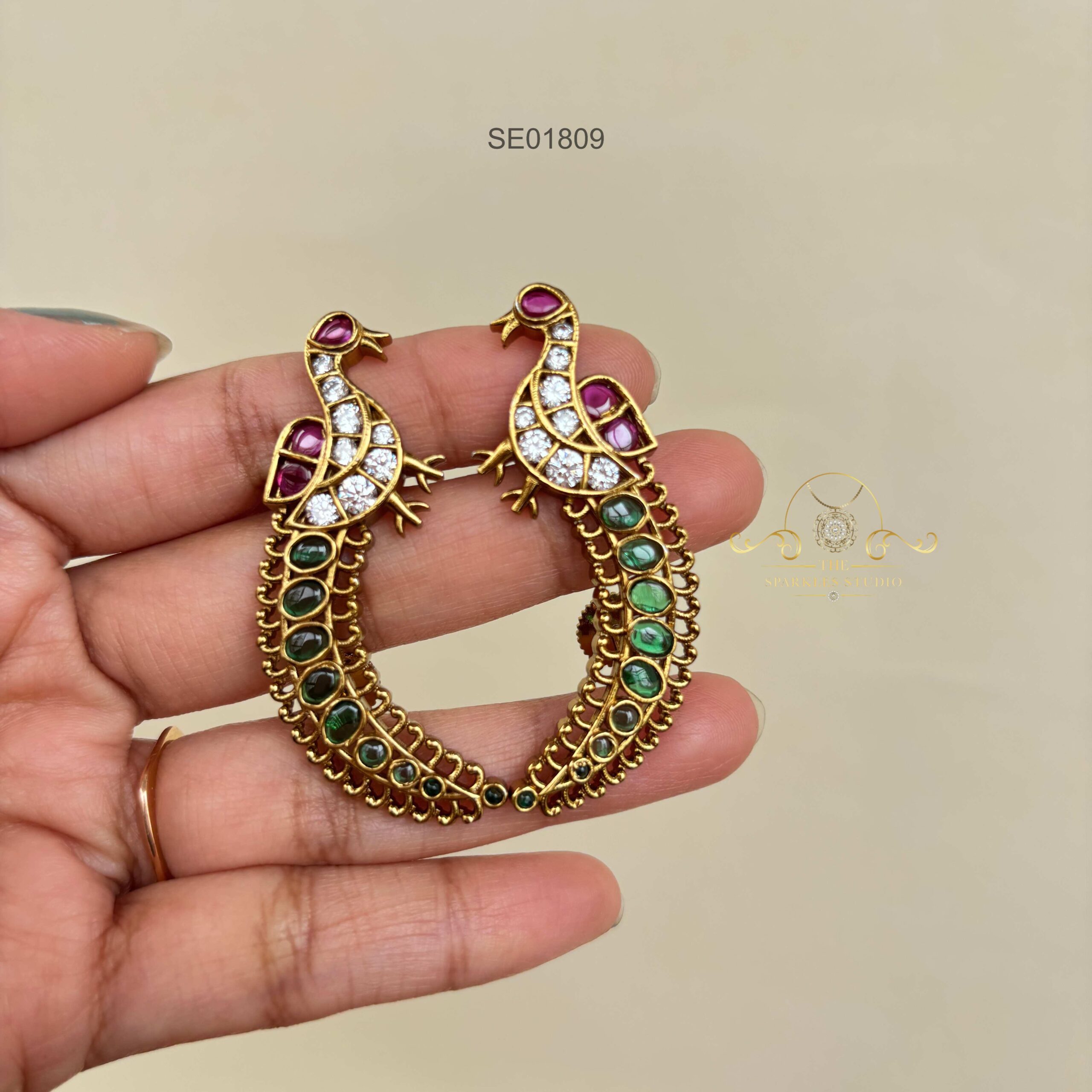 These Peacock Earcuff Earrings showcase a striking blend of traditional artistry and modern flair. Designed with intricate peacock motifs and embellished with colorful stones, they wrap around the ear gracefully, adding a bold statement to festive and bridal looks.
