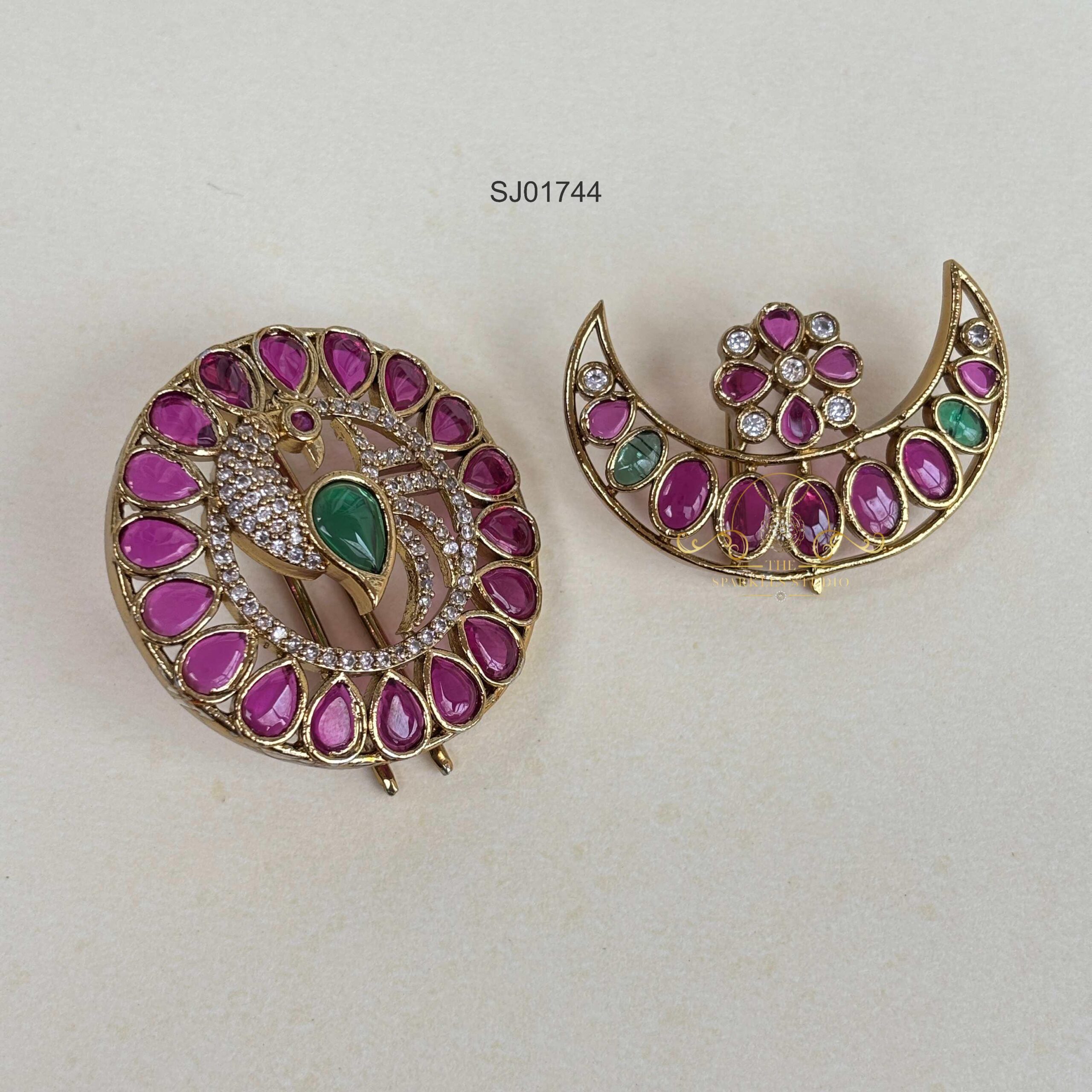 Exquisite Peacock Kemp Sun and Moon Hair Accessory featuring vibrant kemp stones with intricate peacock motifs. Perfect for bridal and festive occasions, it adds celestial charm and traditional elegance to your hairstyle.