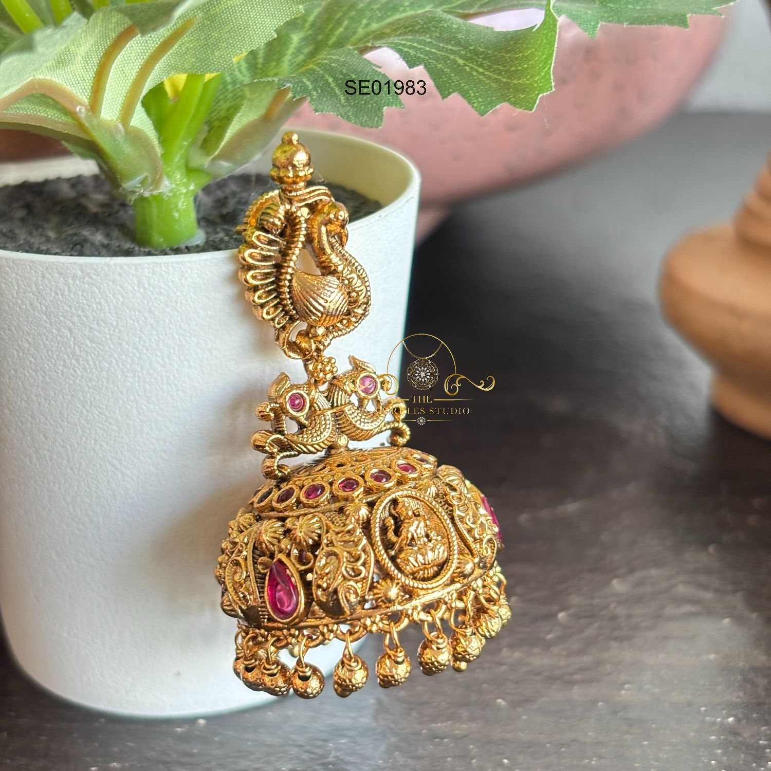 Peacock ruby antique jhumki featuring graceful peacock motifs, deep ruby accents, and rich antique gold finish—perfect for weddings, festivals, and classic temple jewellery lovers.