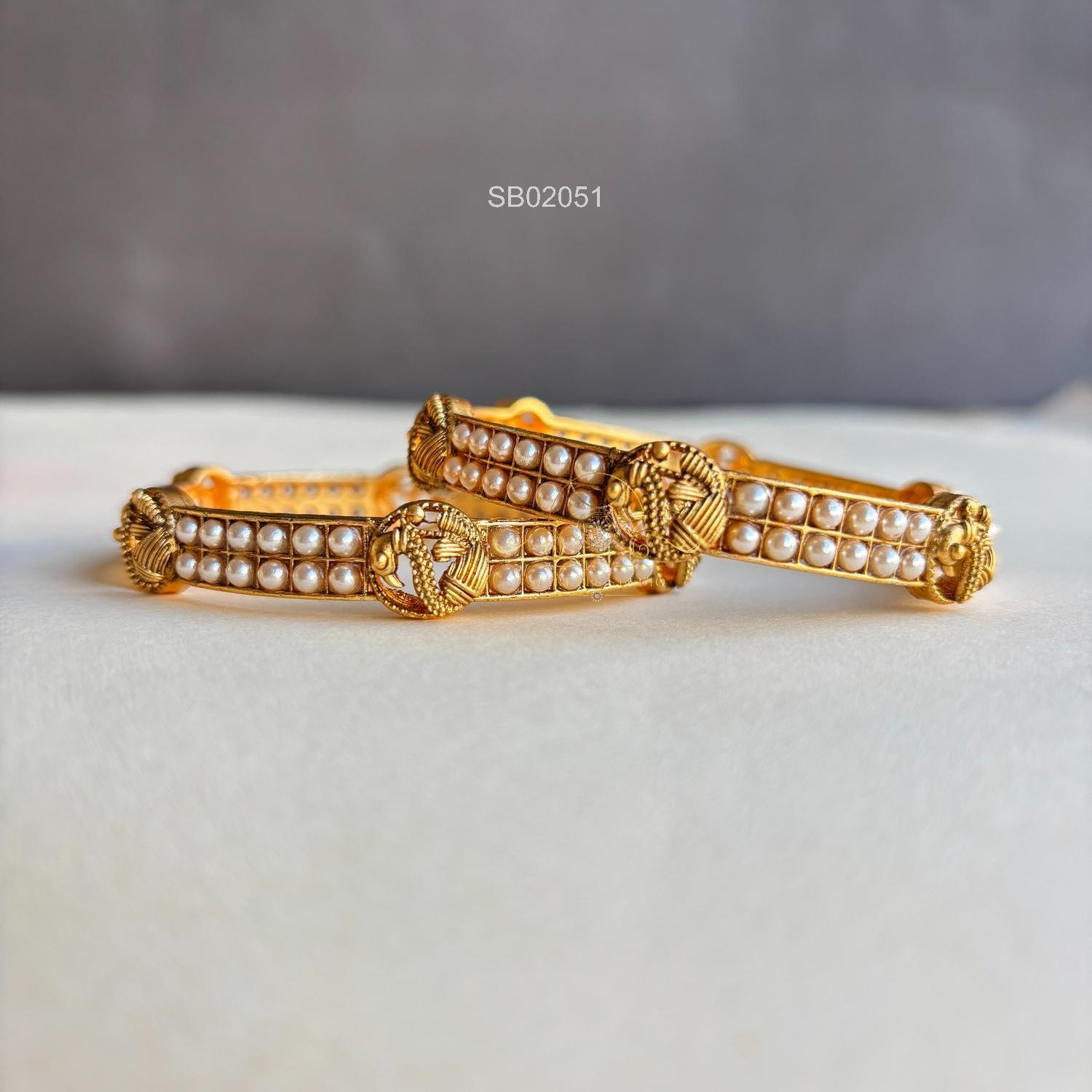 Elegant pearl and peacock antique bangles featuring intricate traditional detailing and graceful motifs. Perfect for weddings and festive occasions, they add royal charm, heritage elegance, and timeless beauty to your ethnic look.