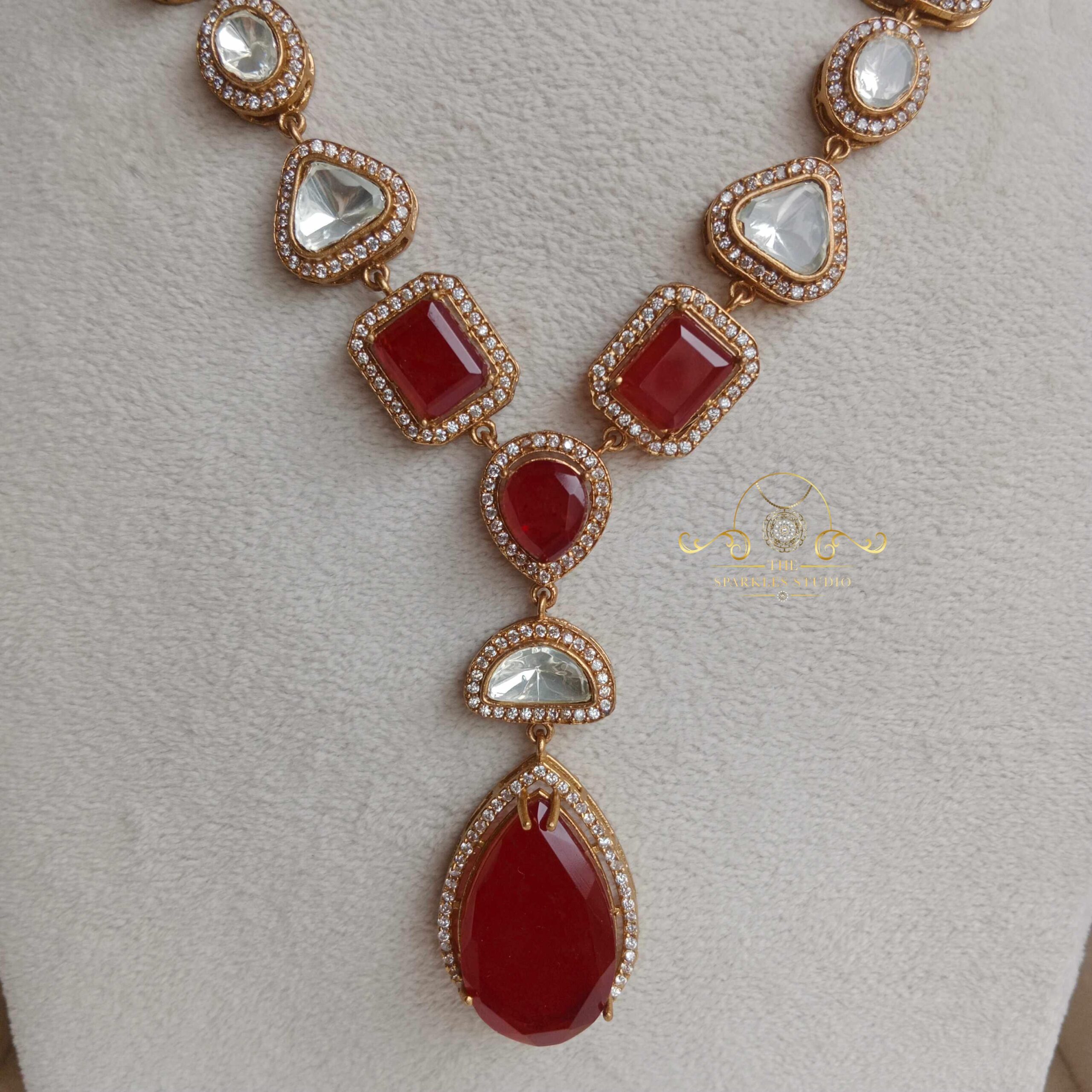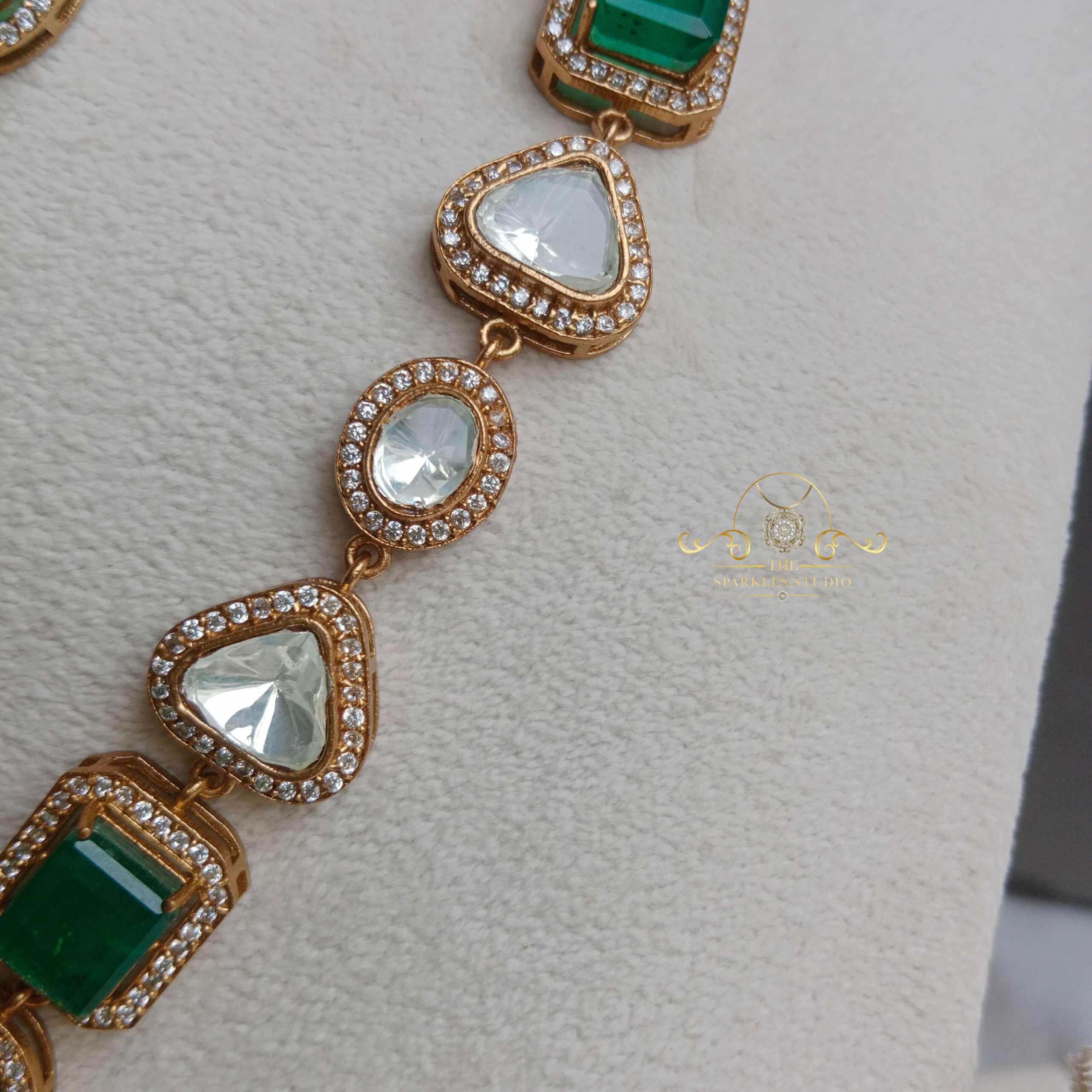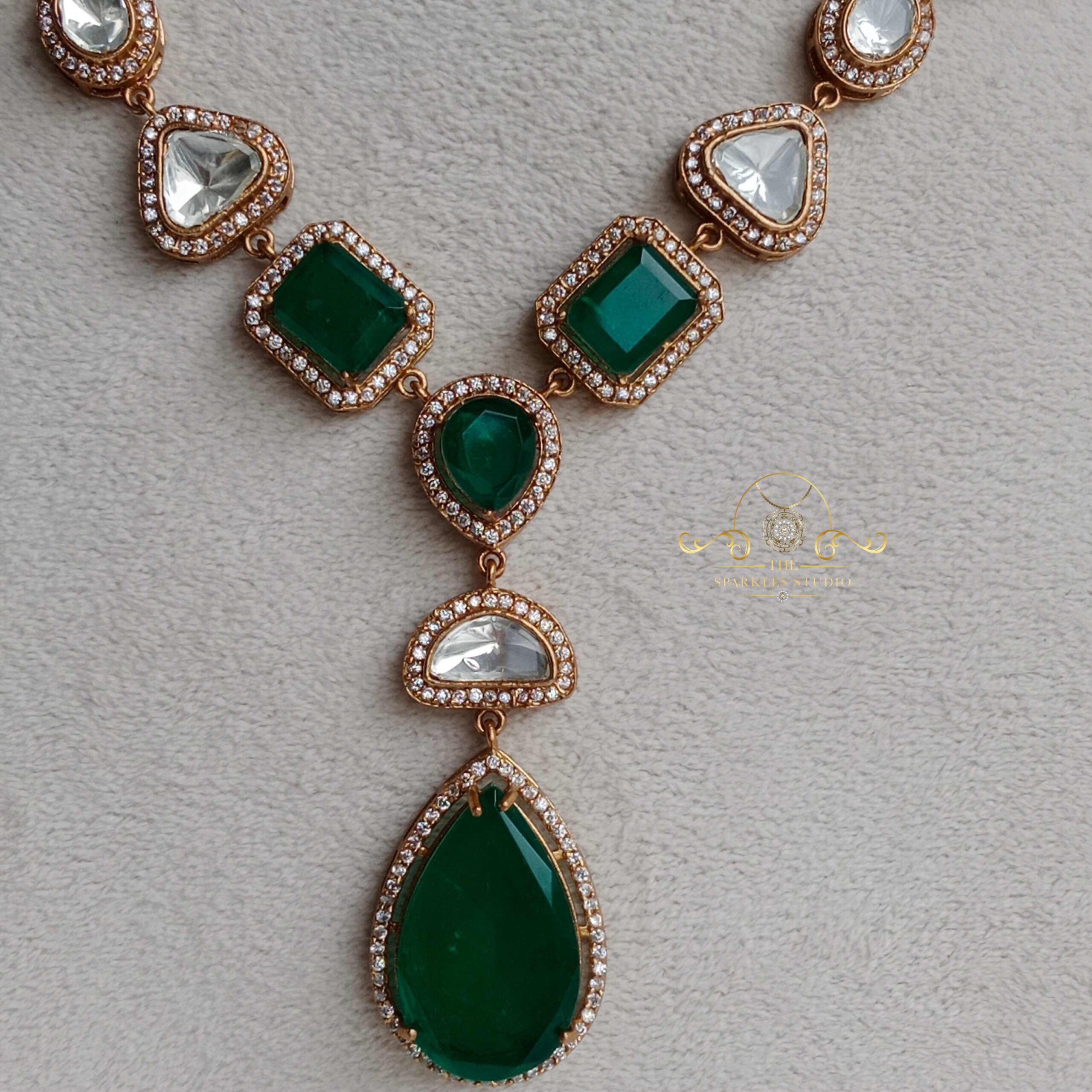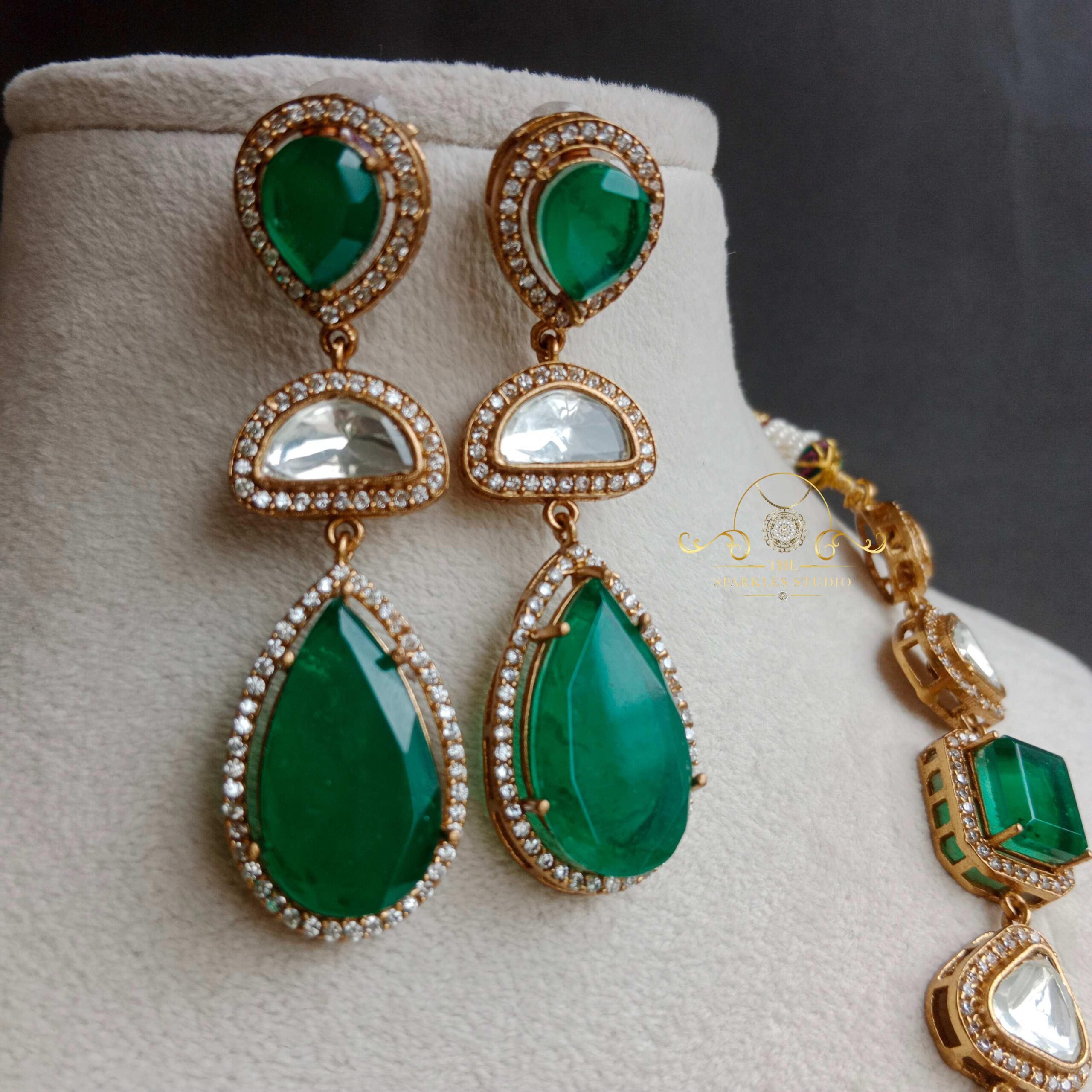 Polki Ruby Emerald Stone Necklace featuring shimmering polki work, rich ruby accents, and elegant emerald drops. A regal and timeless piece perfect for festive, bridal, or traditional celebrations with effortless grace.
