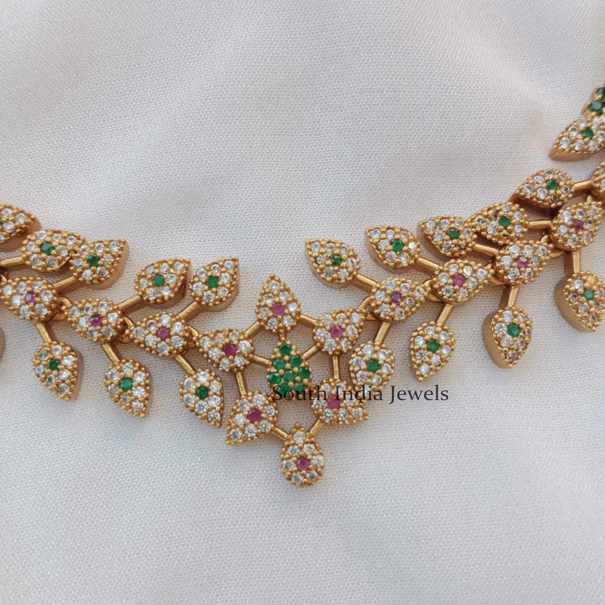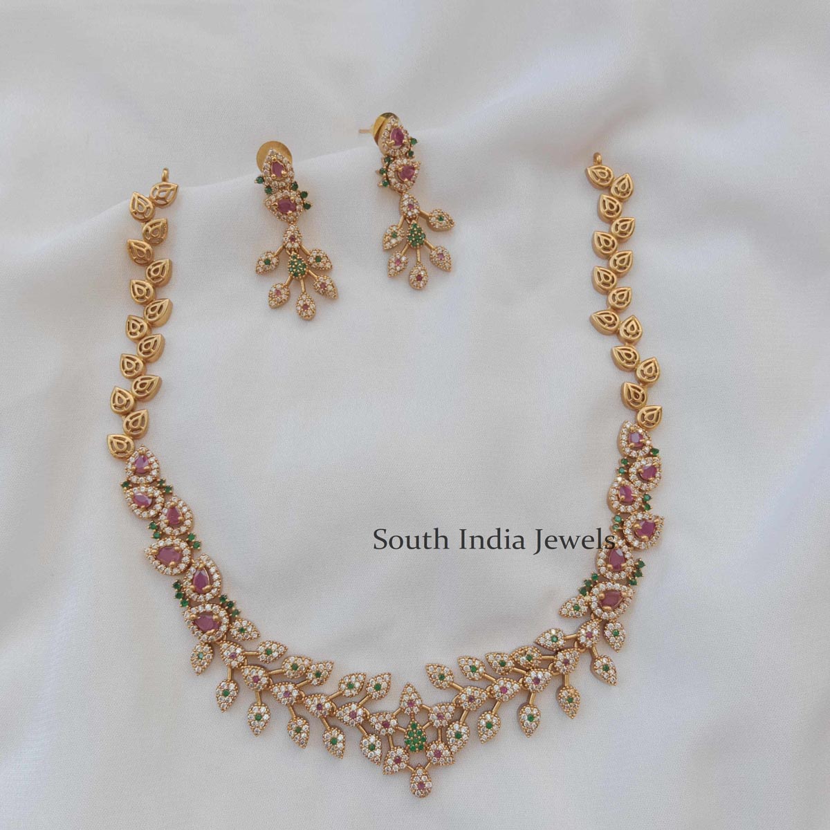 The Pretty CZ Stone Leaf Neckset is a charming piece featuring leaf-shaped designs adorned with Cubic Zirconia stones.
