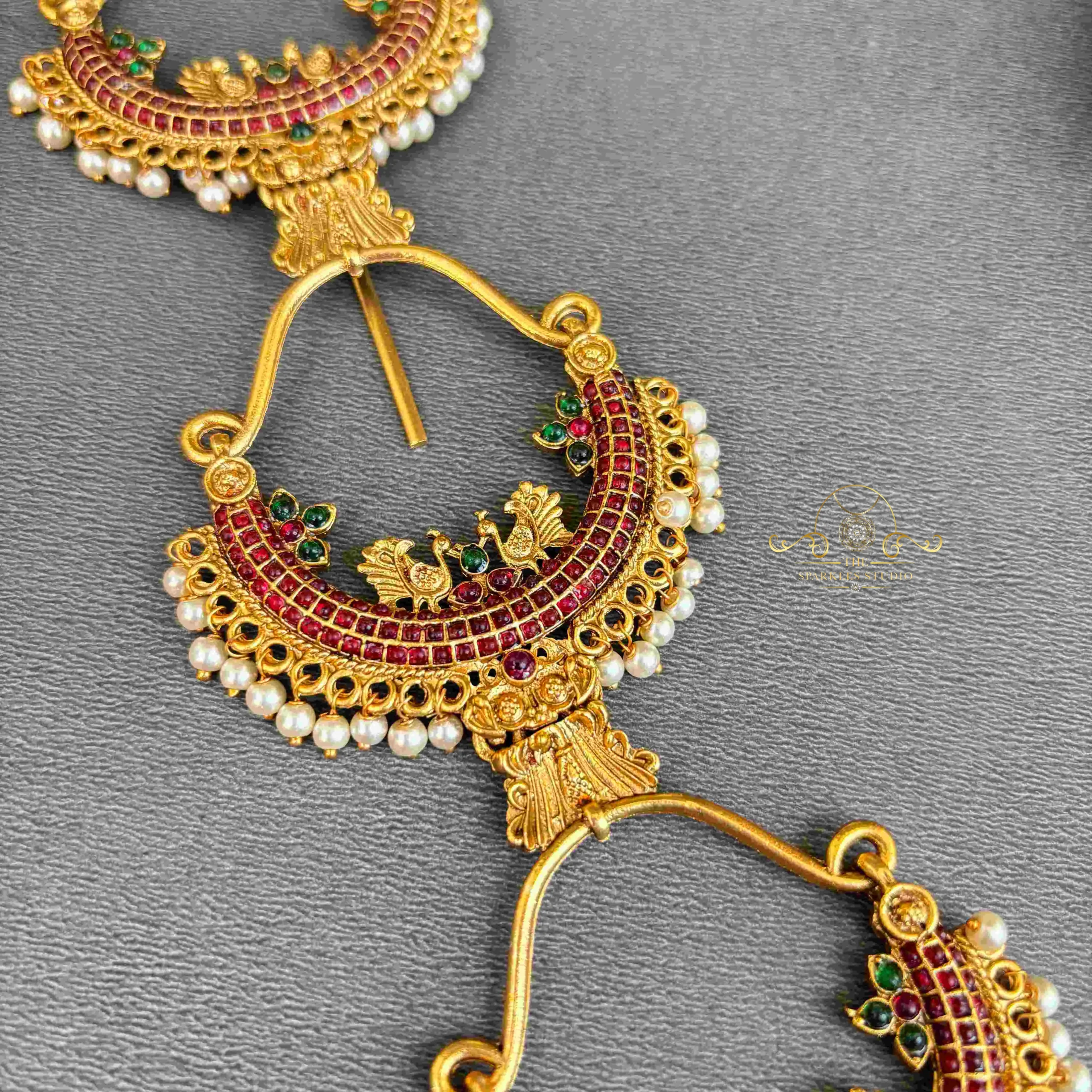 Adorn yourself with the regal charm of Elephant Studs featuring Emerald and White Stone Hanging with Pearl Drops. These intricately designed earrings combine the symbolism of elephants with the richness of emerald and white stones, creating a stunning accessory.