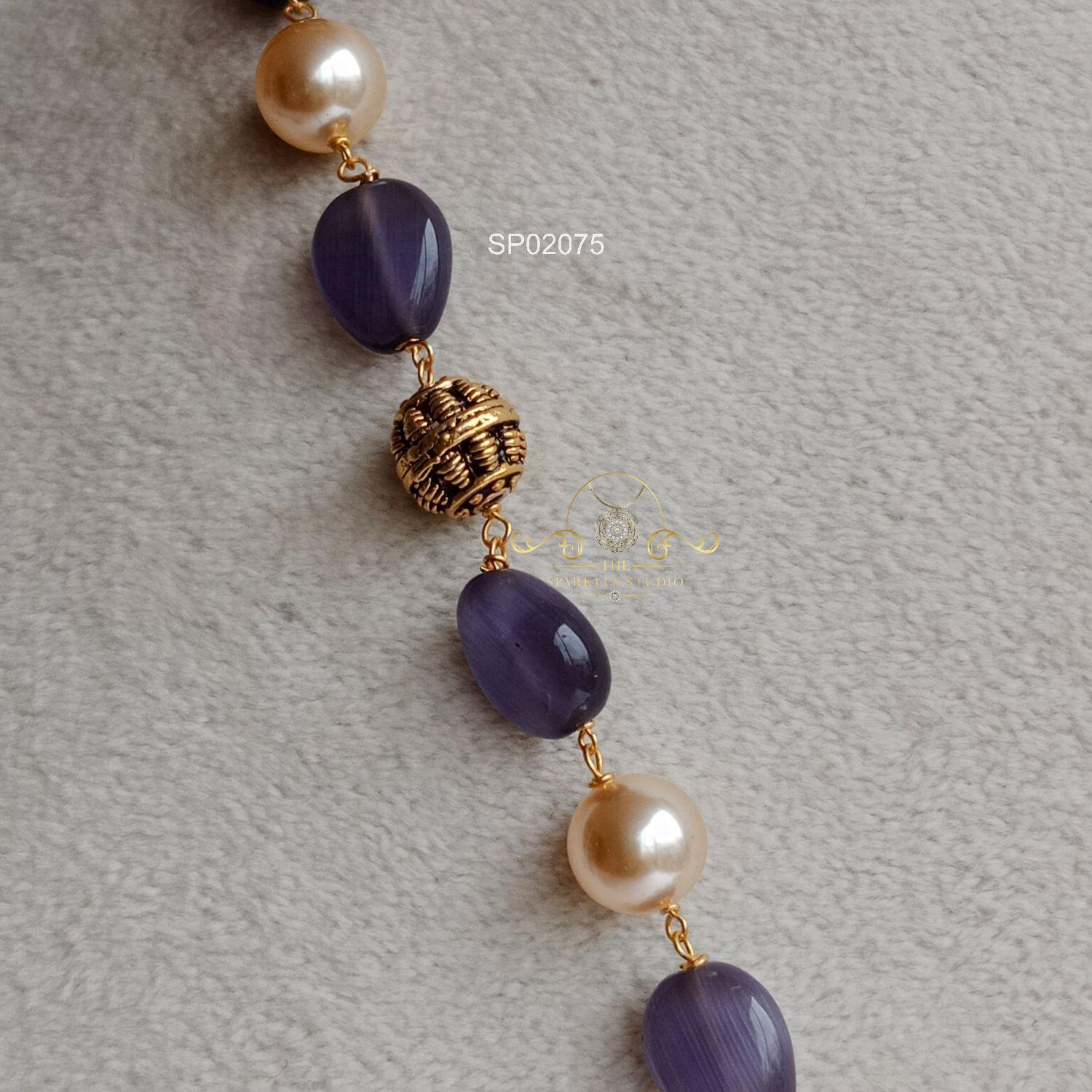 Elegant Purple Bead Lakshmi Pearl Mala featuring vibrant purple beads, delicate pearls, and a divine Lakshmi pendant, creating a graceful traditional look perfect for weddings, festivals, and classic saree styling.