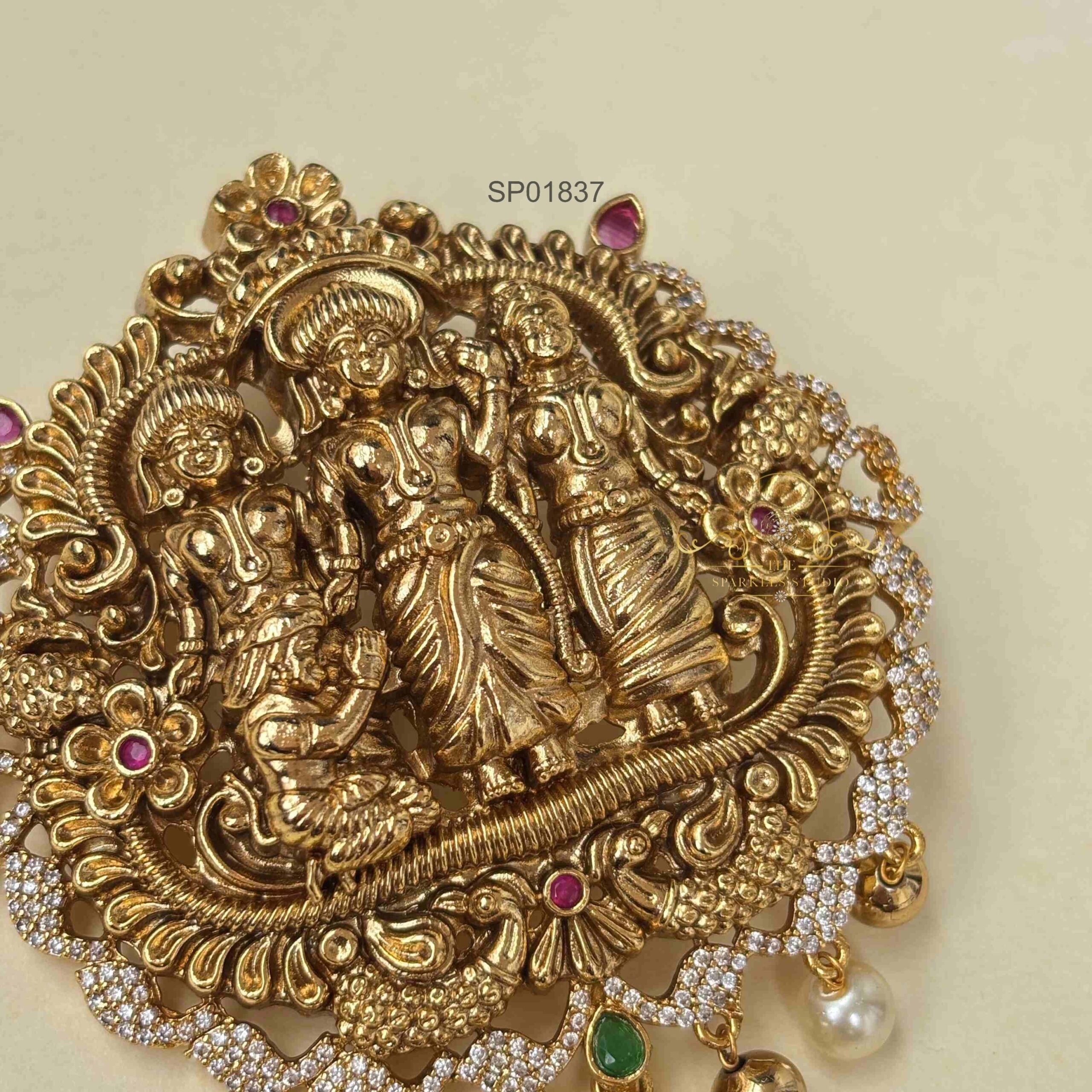 Divine Ram Parivar Pendant Set featuring intricate gold-tone detailing and sacred motifs, symbolizing unity and devotion—perfect for pairing with traditional attire during festive and spiritual occasions.