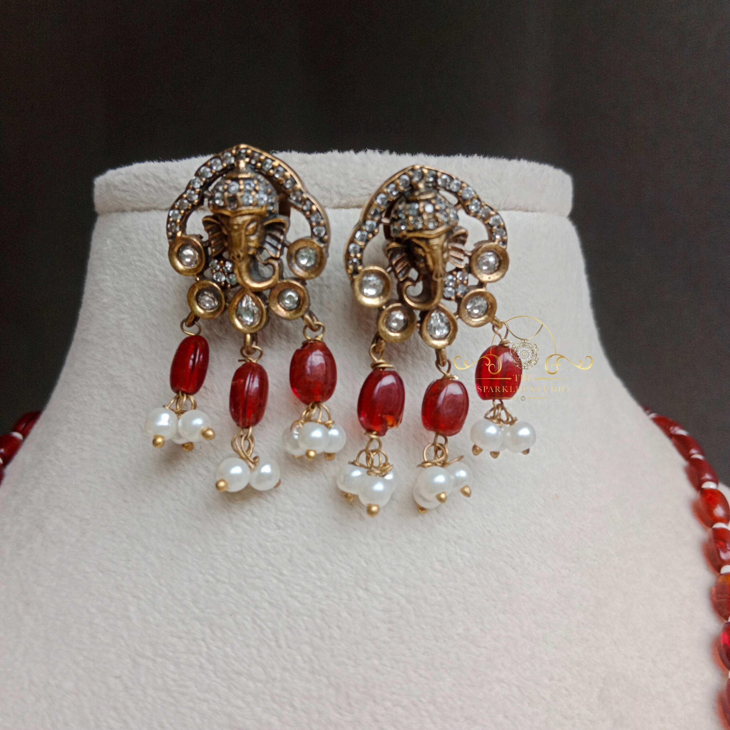 The Red Bead Ganesha Pendant Long Haram features a divine Ganesha pendant adorned with intricate detailing and rich red beads. Perfect for festive and traditional occasions, it radiates spiritual grace and elegance.