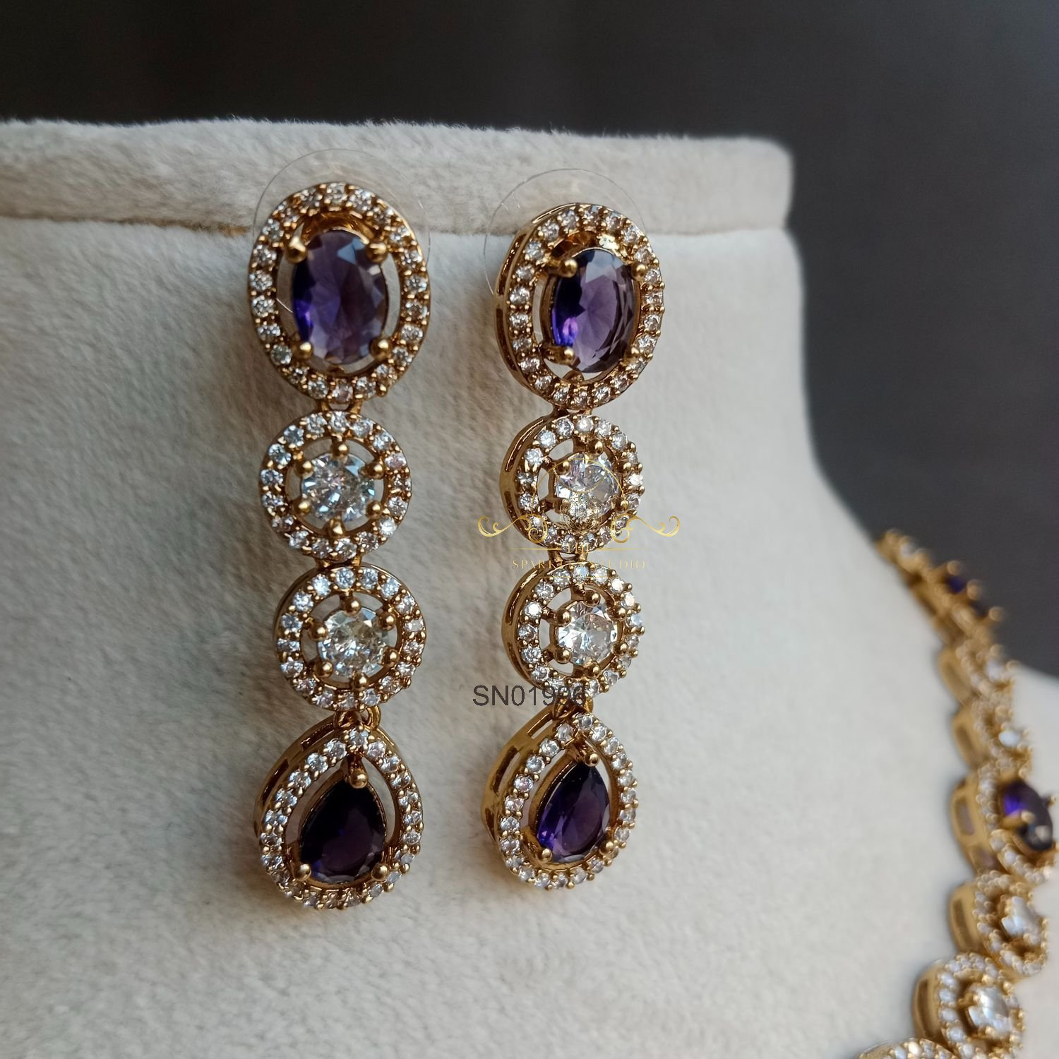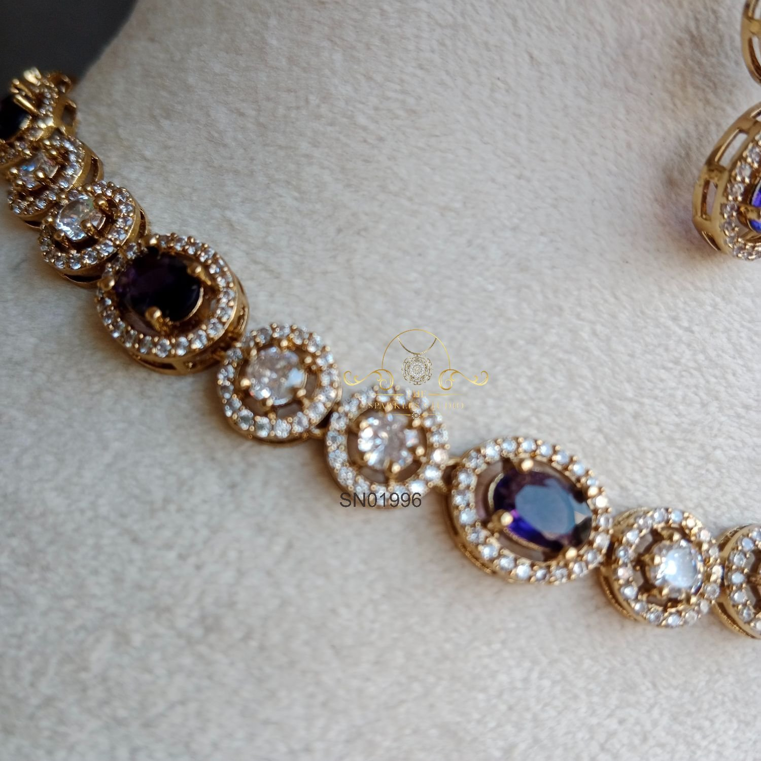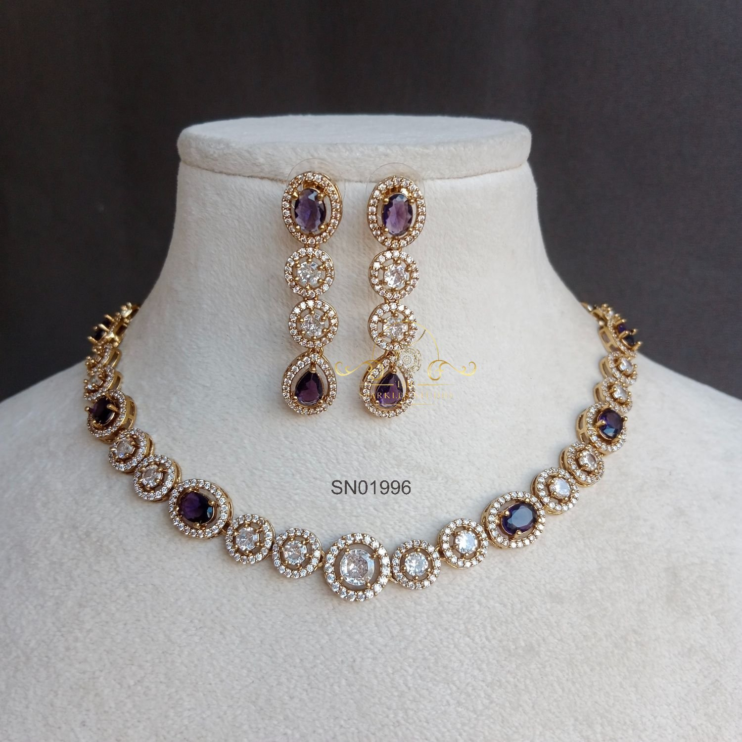 The Round AD Purple Stone Necklace features sparkling American diamonds with rich purple stones, creating a graceful, elegant design—perfect for festive occasions, weddings, and adding a royal touch to ethnic outfits.