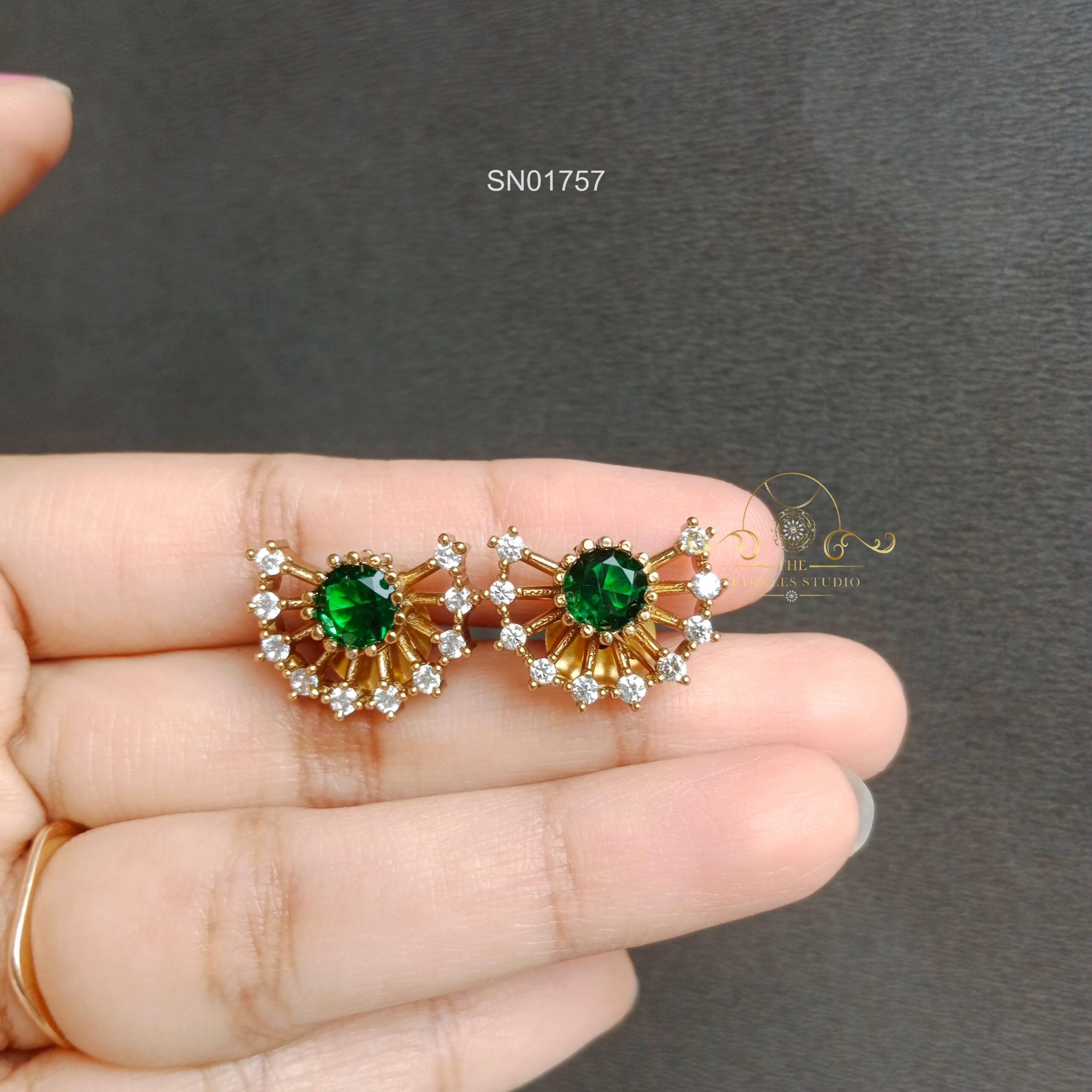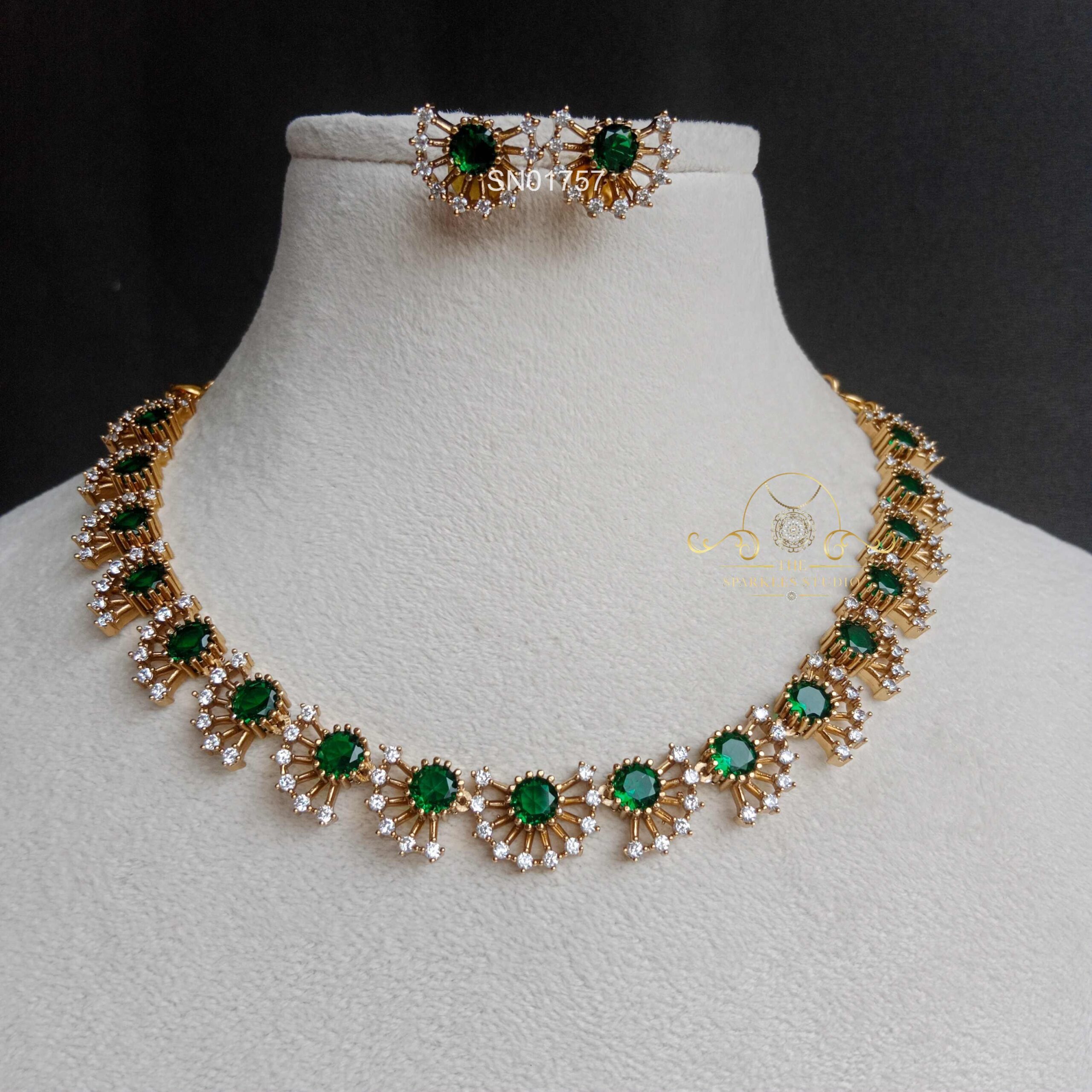 The round emerald AD necklace sparkles with elegance, featuring dazzling American diamonds beautifully paired with a central emerald stone. Perfect for festive wear, weddings, or evening celebrations, it blends timeless grace with modern allure.