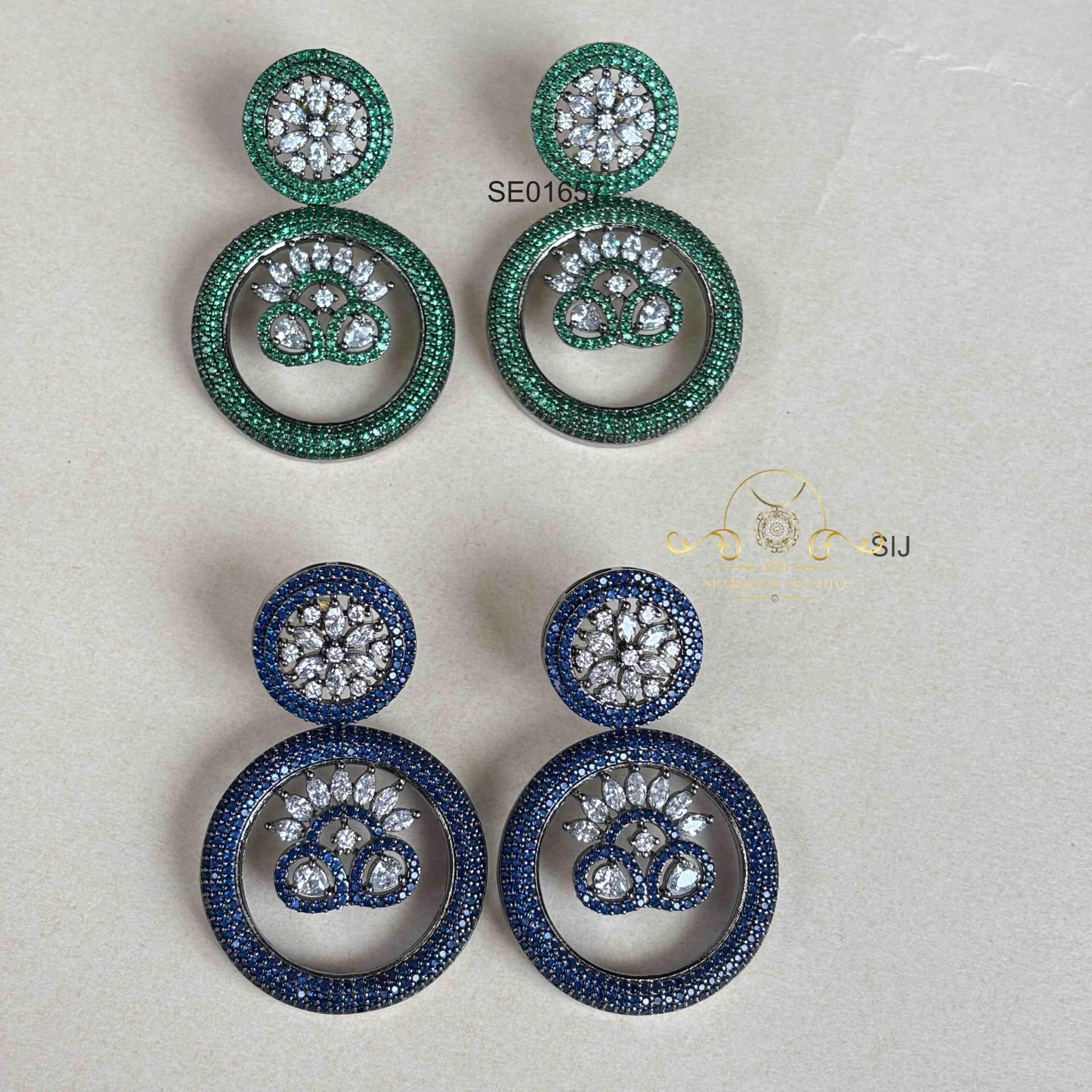These round sapphire and emerald drop earrings blend regal elegance with a pop of vibrant color. Their classic silhouette and rich hues make them perfect for festive occasions and glamorous evening looks.