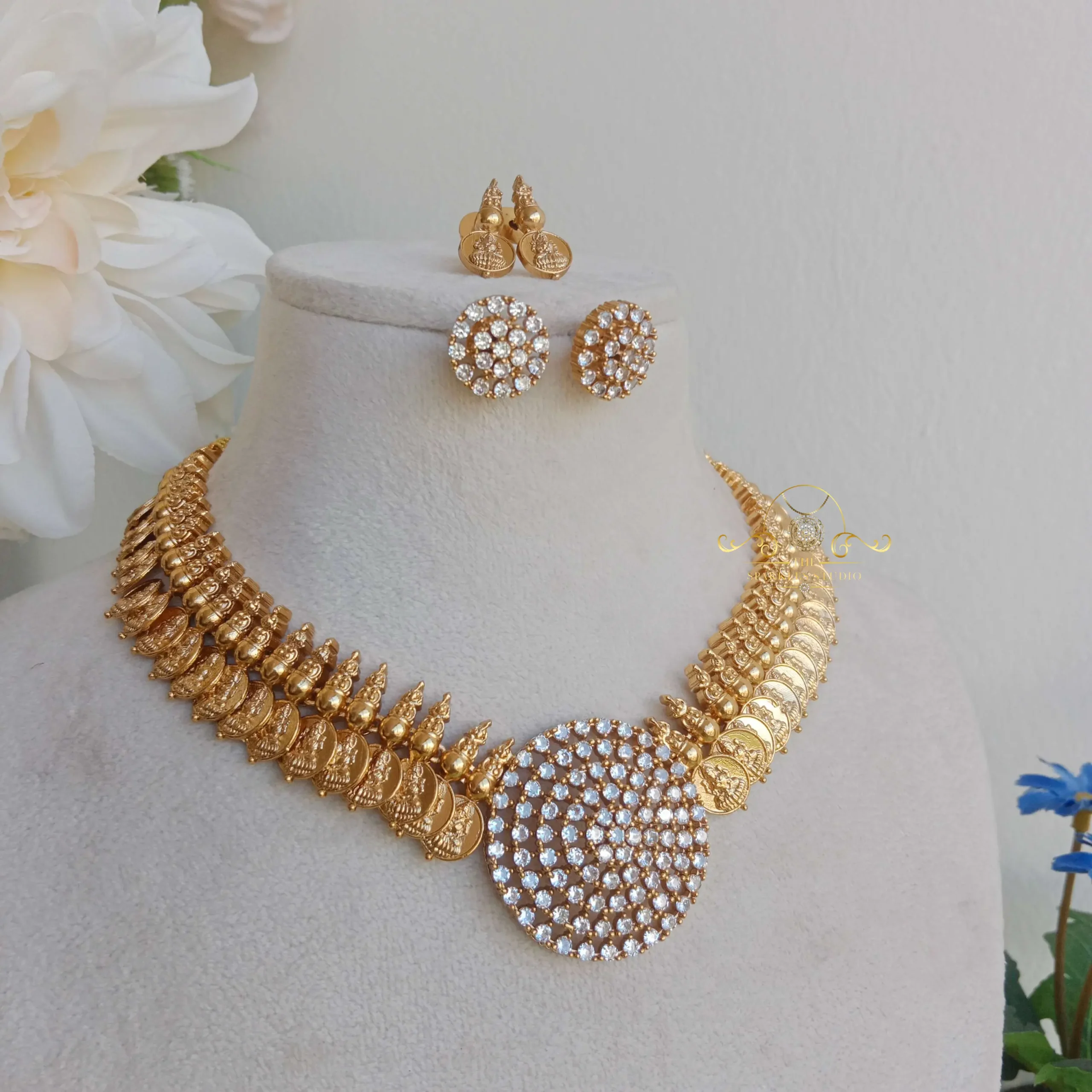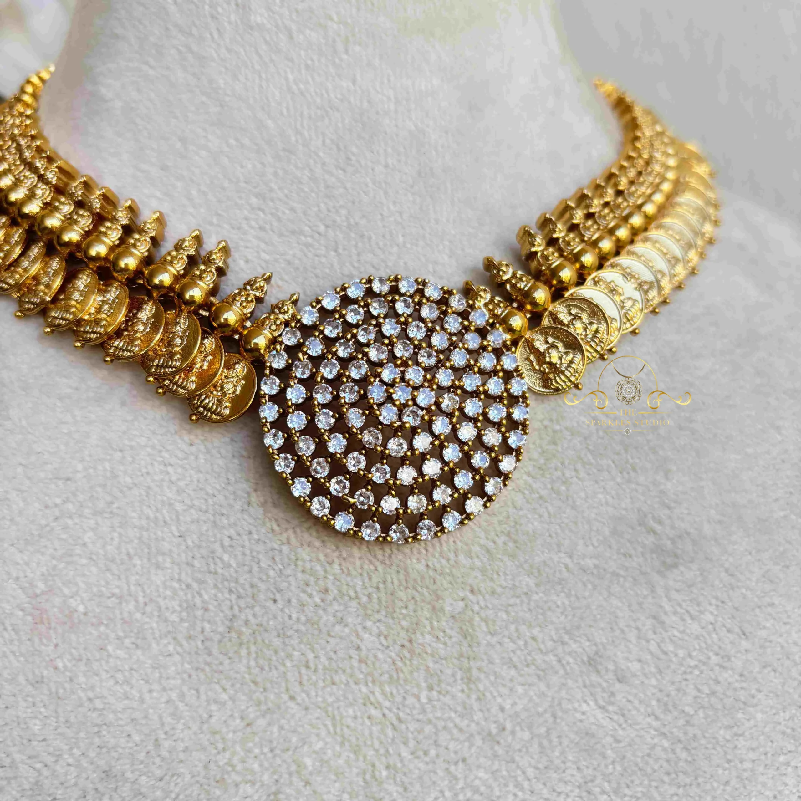 This Royal Kasumala with an AD pendant combines timeless tradition with sparkling elegance. Featuring intricately crafted gold coins and a dazzling American diamond pendant, it’s perfect for weddings and festive celebrations.