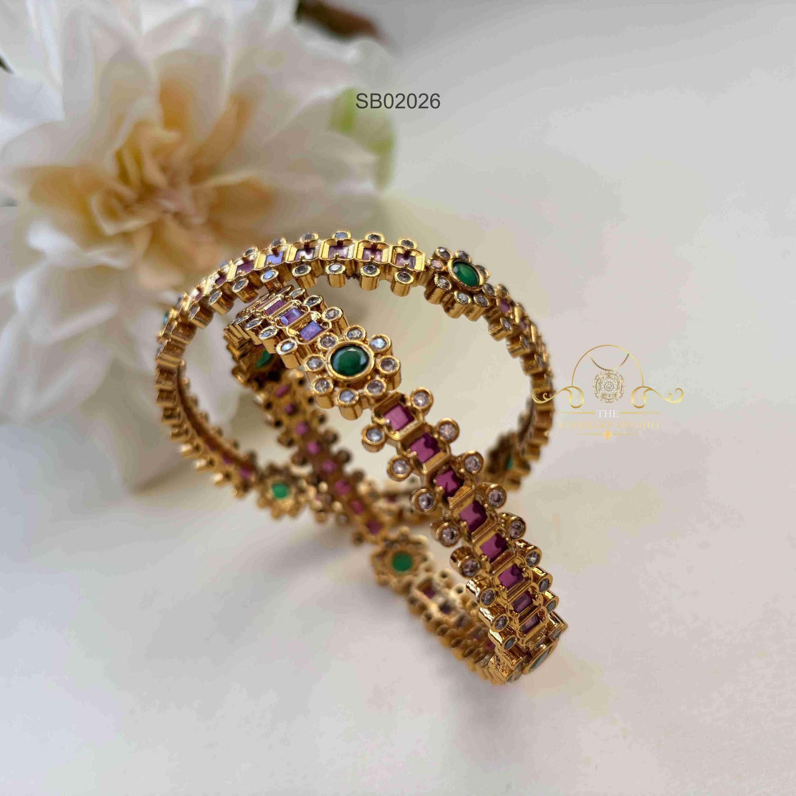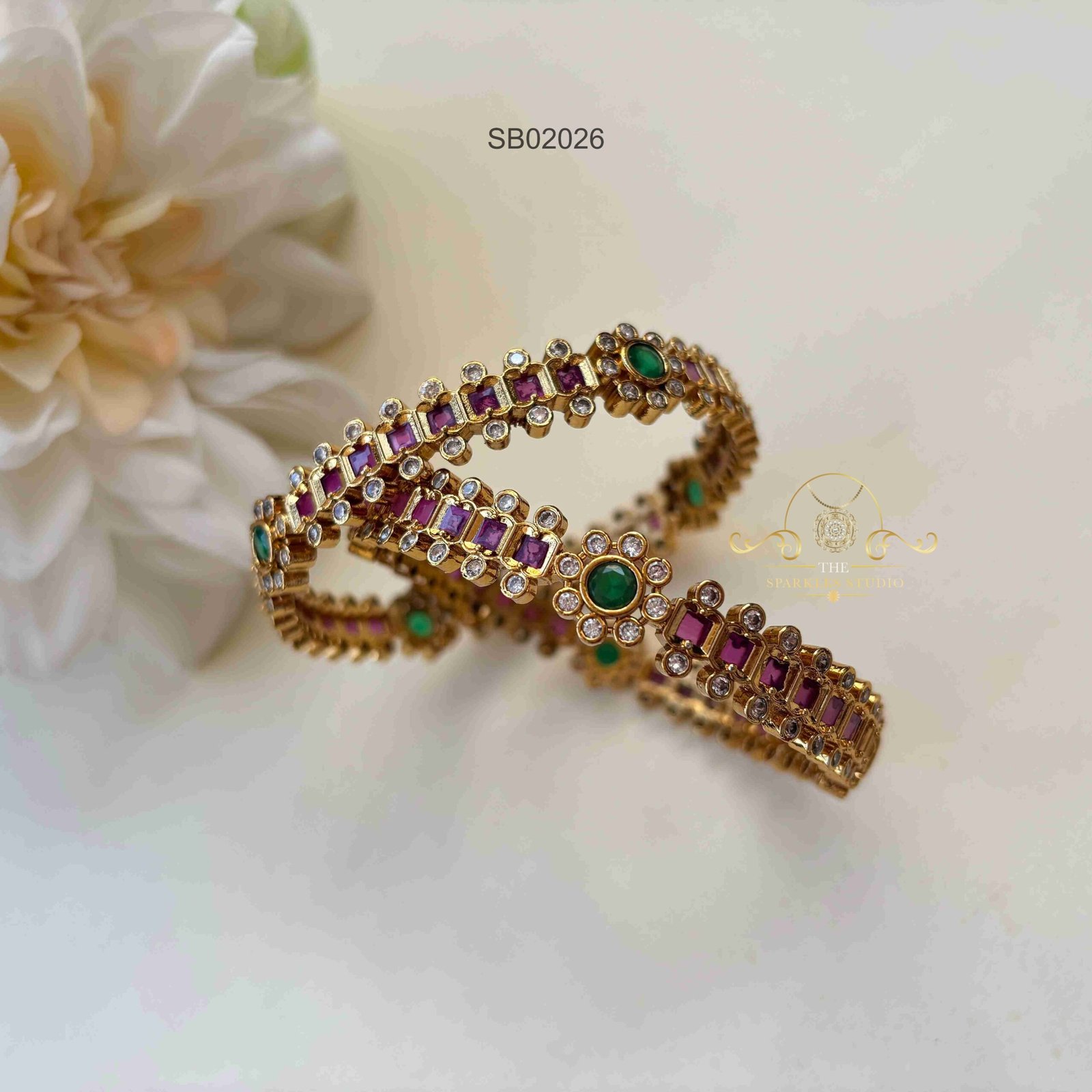 Ruby AD Bangles feature rich ruby-toned stones beautifully framed with sparkling American diamonds. Elegant and eye-catching, these bangles add vibrant colour and radiant charm to festive, wedding, and special occasion looks.