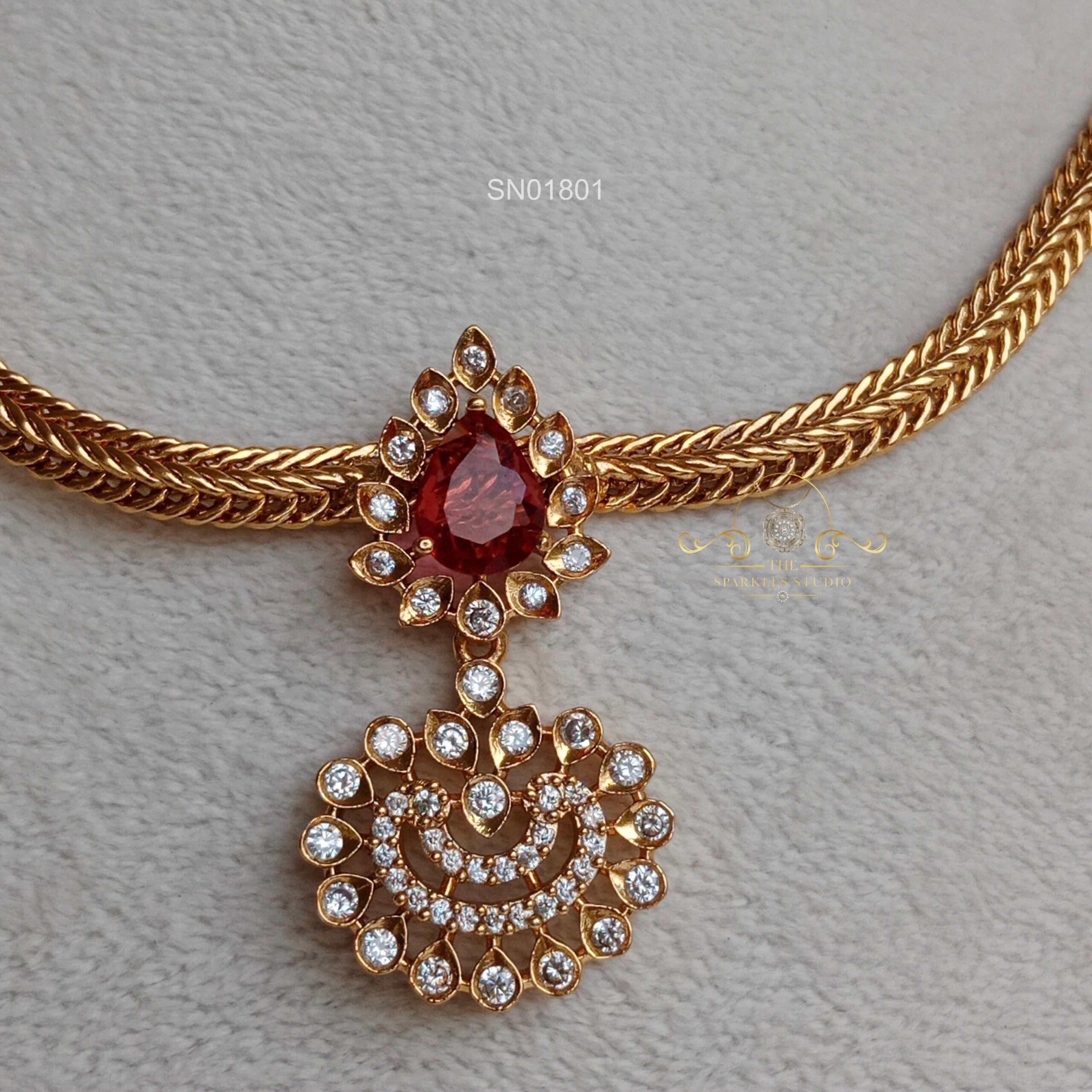 This Ruby and AD Pendant Necklace blends rich ruby tones with sparkling AD stones, creating a timeless piece. Perfect for weddings and festive wear, it adds elegance and charm to every traditional outfit.