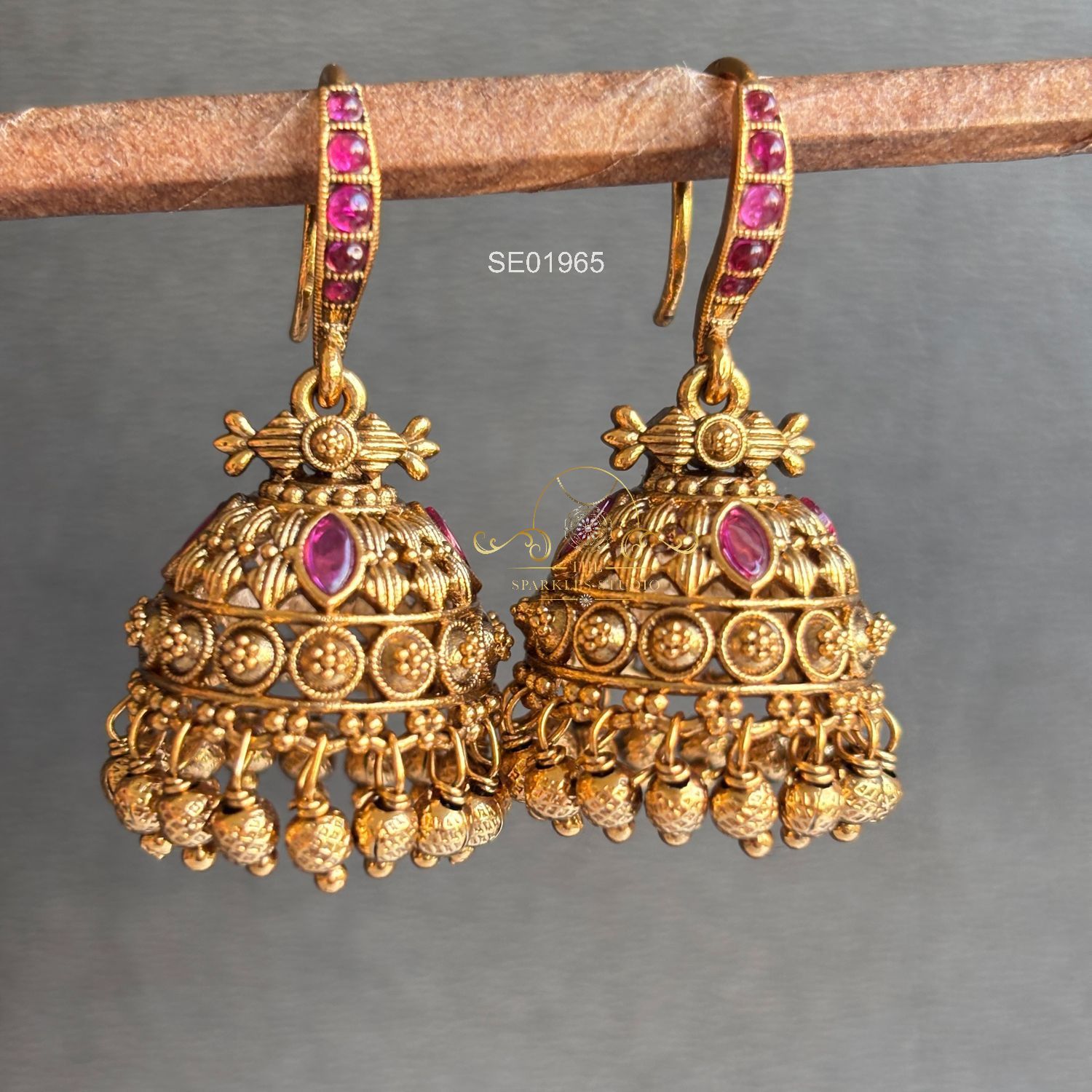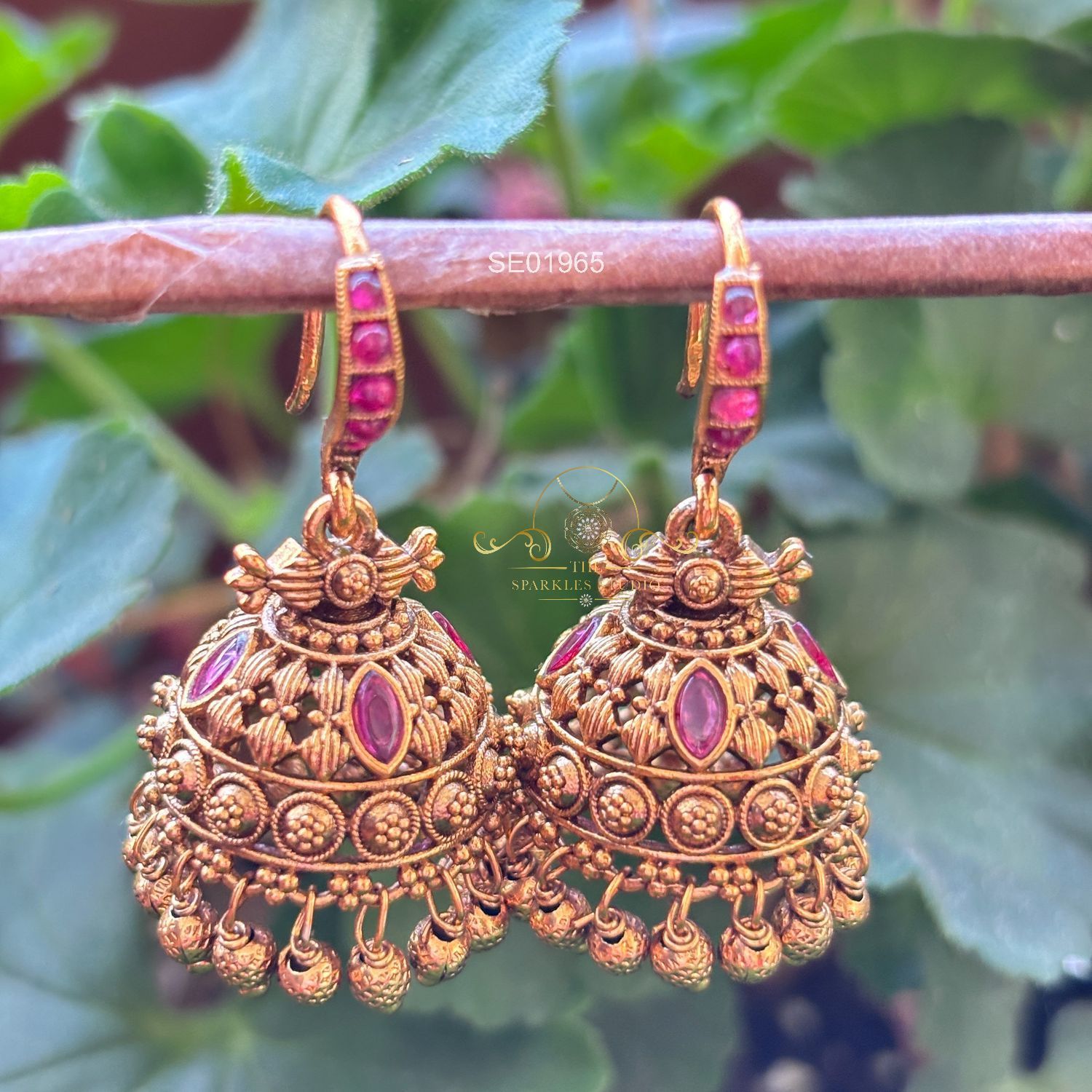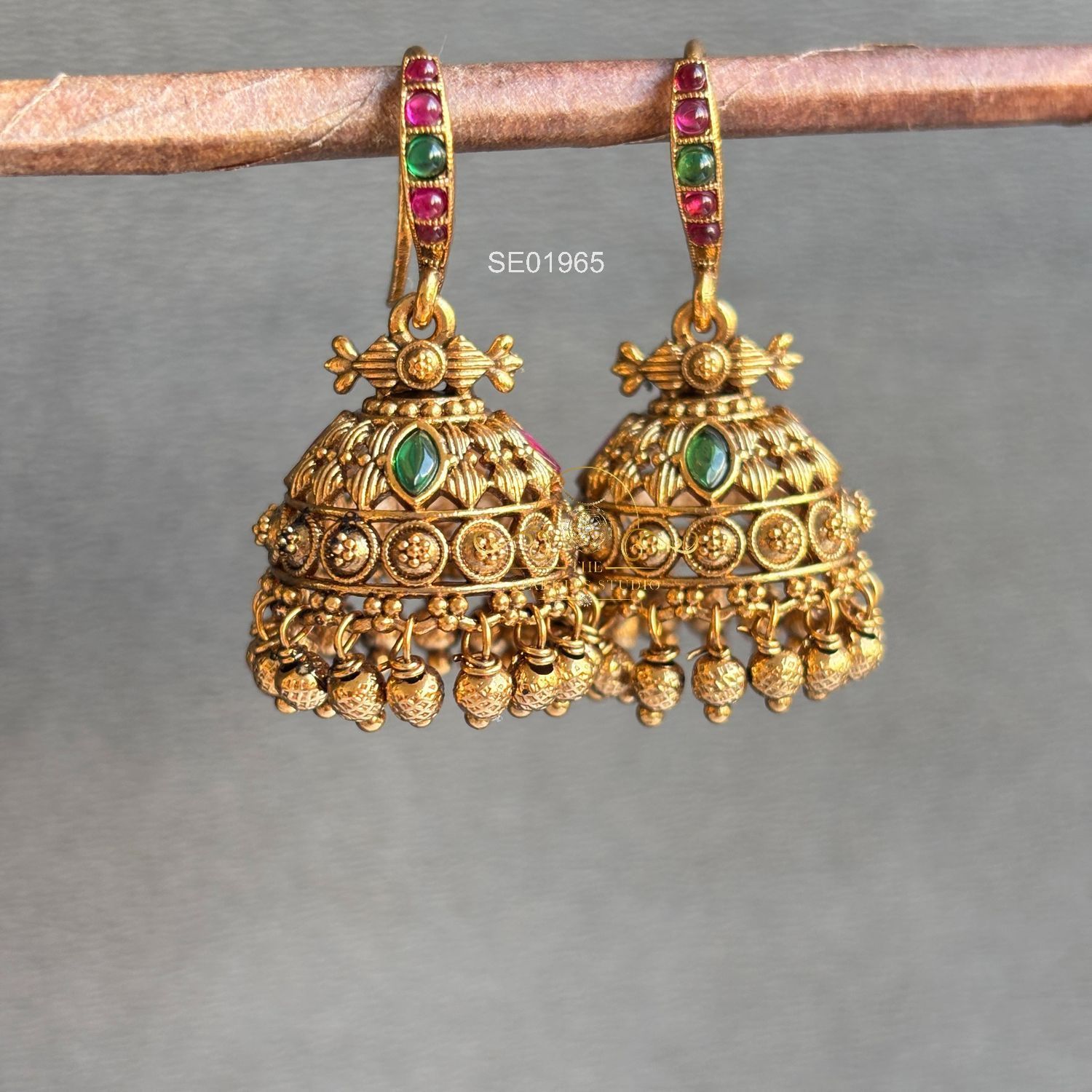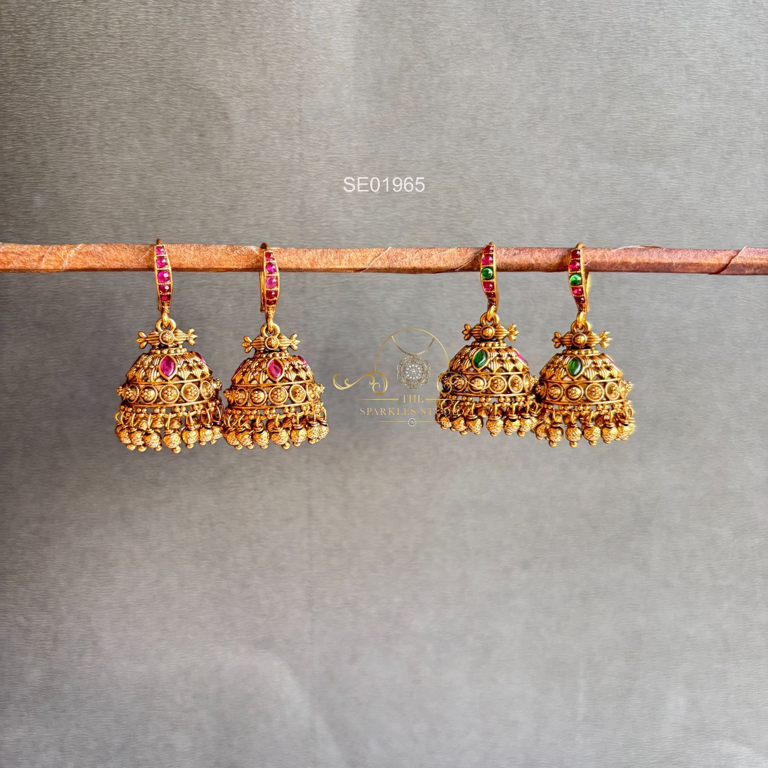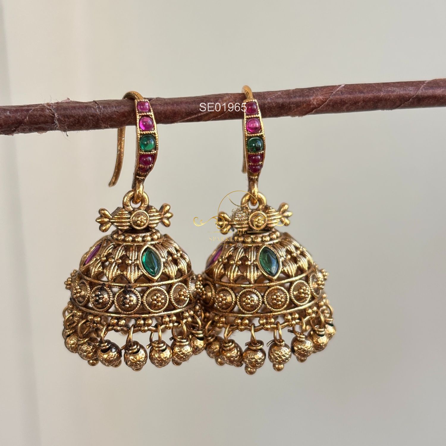 The Pretty Peacock Jhumki with Red and Green Stones is a charming pair of earrings inspired by the graceful peacock. These jhumkis feature intricate designs with colorful red and green stones, reminiscent of the vibrant plumage of a peacock.