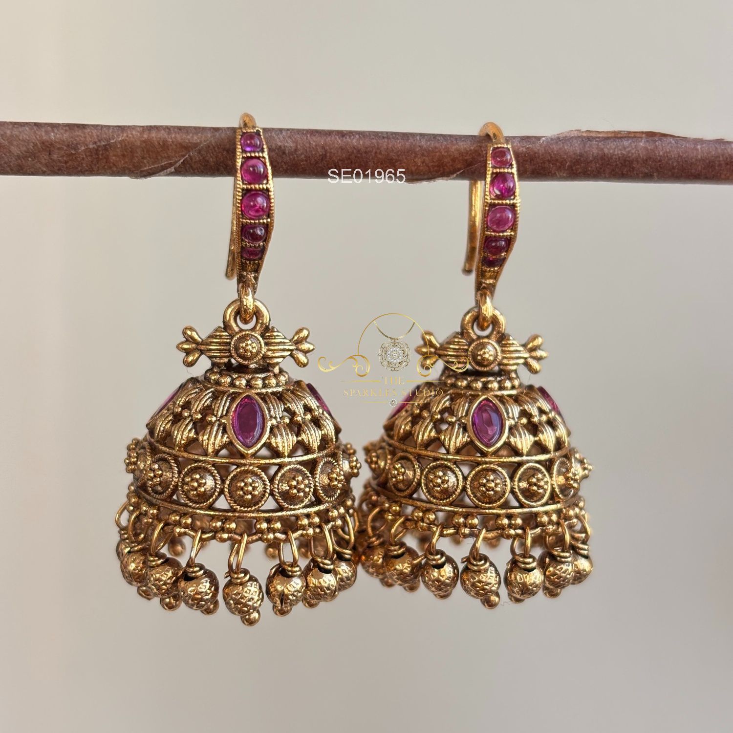 Ruby emerald hoop jhumkis featuring rich red and green stones, blending classic elegance with festive charm—perfect for weddings, celebrations, and adding royal colour to traditional outfits.
