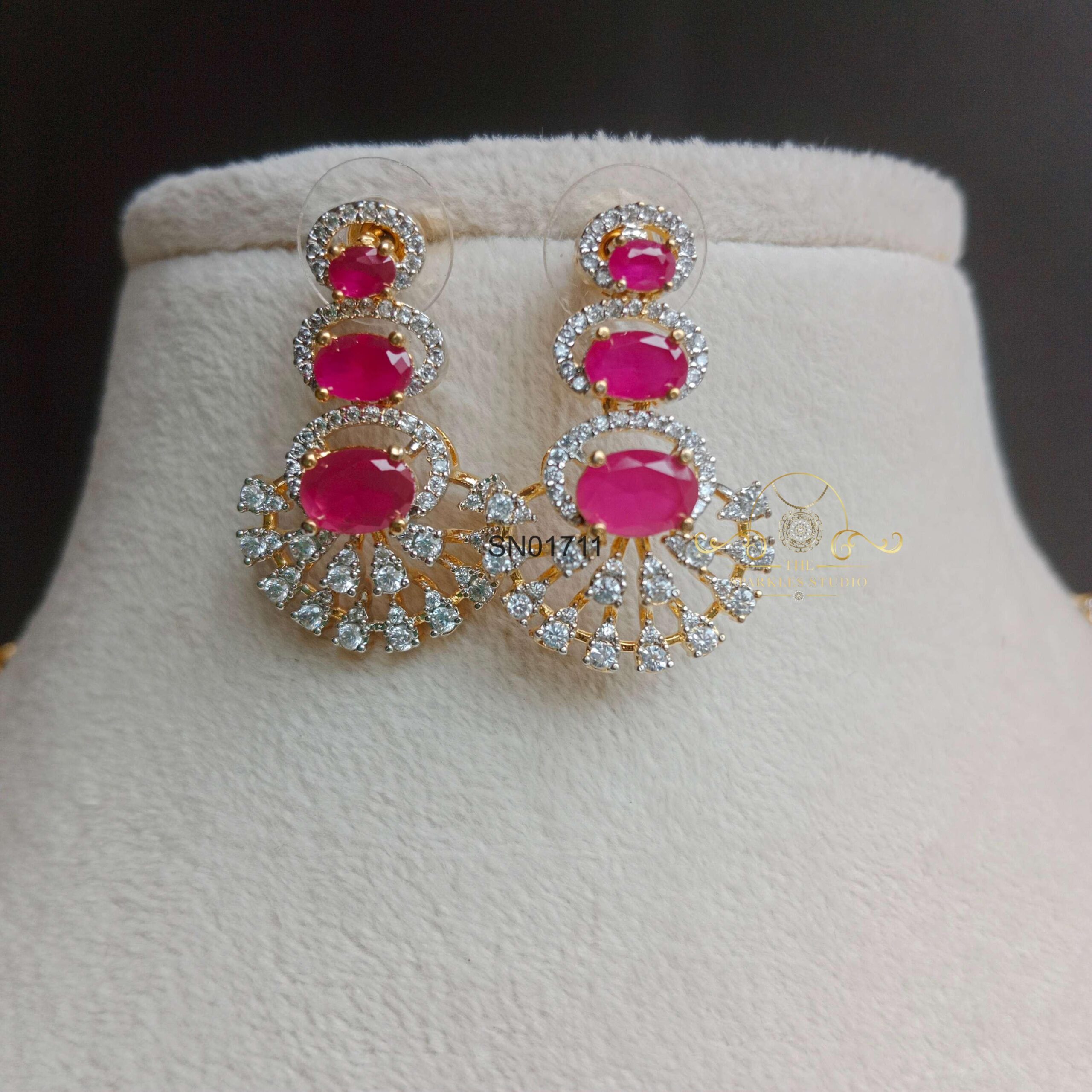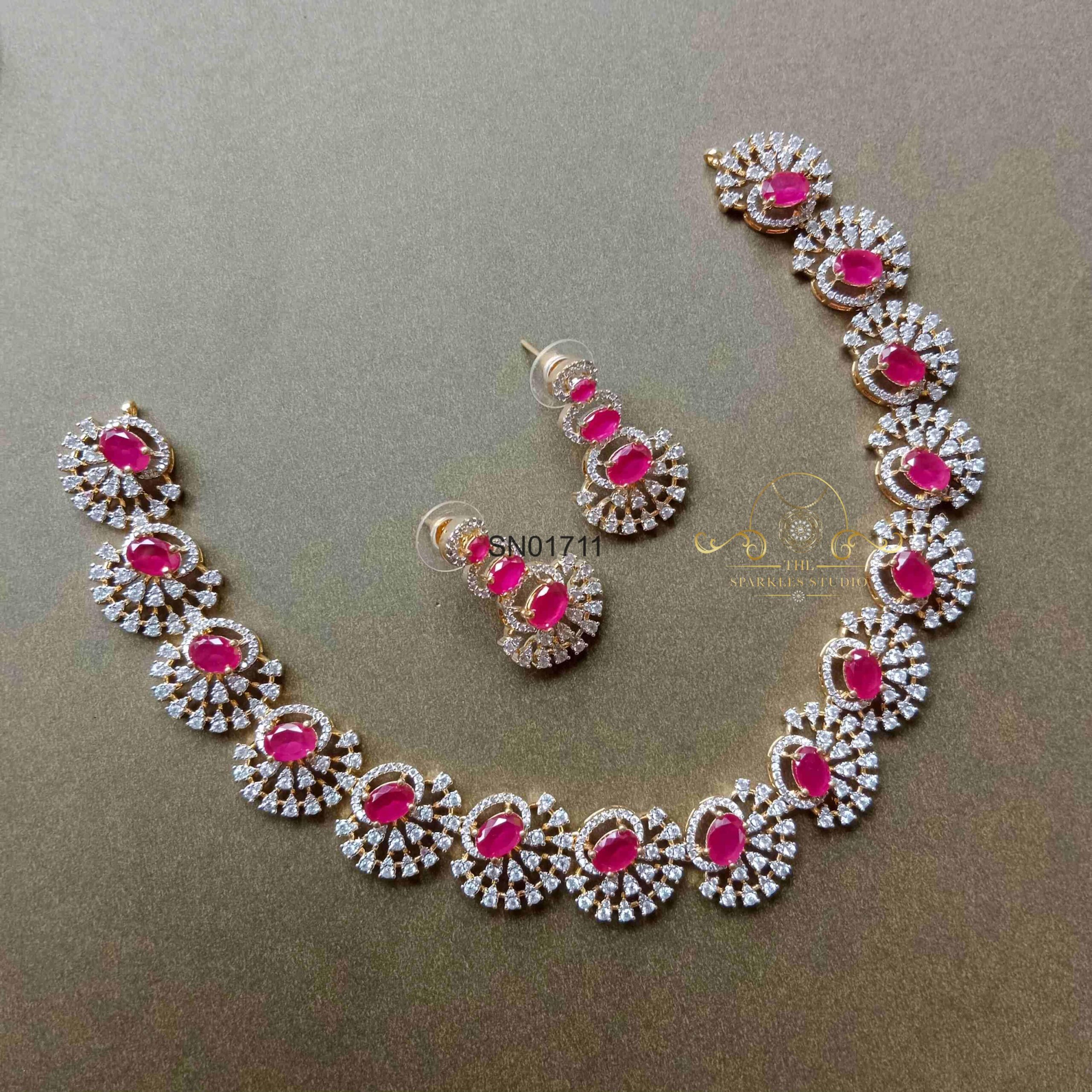 The Ruby Half Flower AD Necklace Set features radiant ruby stones highlighted with sparkling American Diamonds. Its graceful floral design makes it perfect for weddings, festive occasions, and elegant traditional looks.