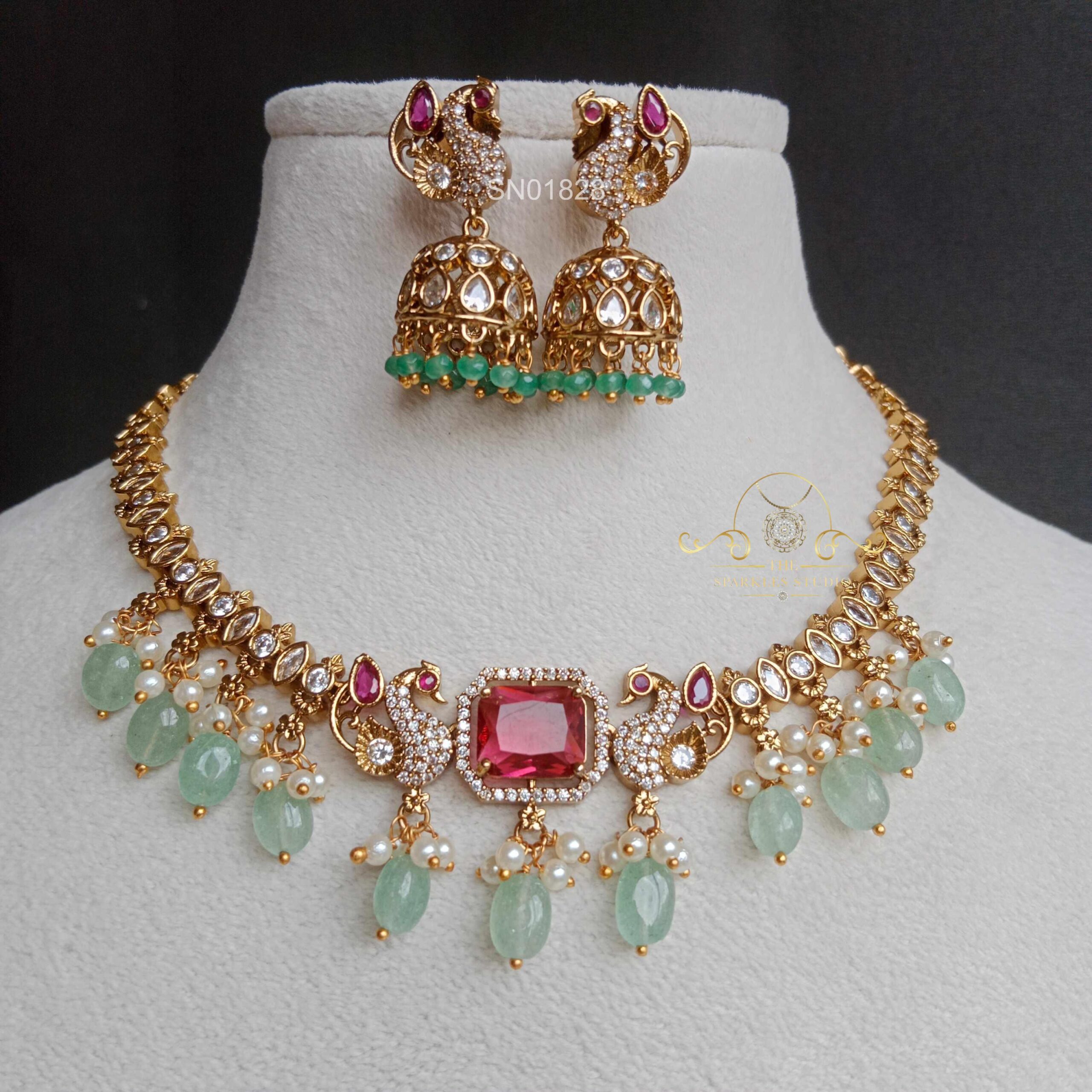 The Ruby Peacock Victorian Necklace radiates royal charm with dazzling ruby stones and intricate peacock motifs. Perfect for weddings and festive occasions, it adds a regal vintage touch to any traditional look.