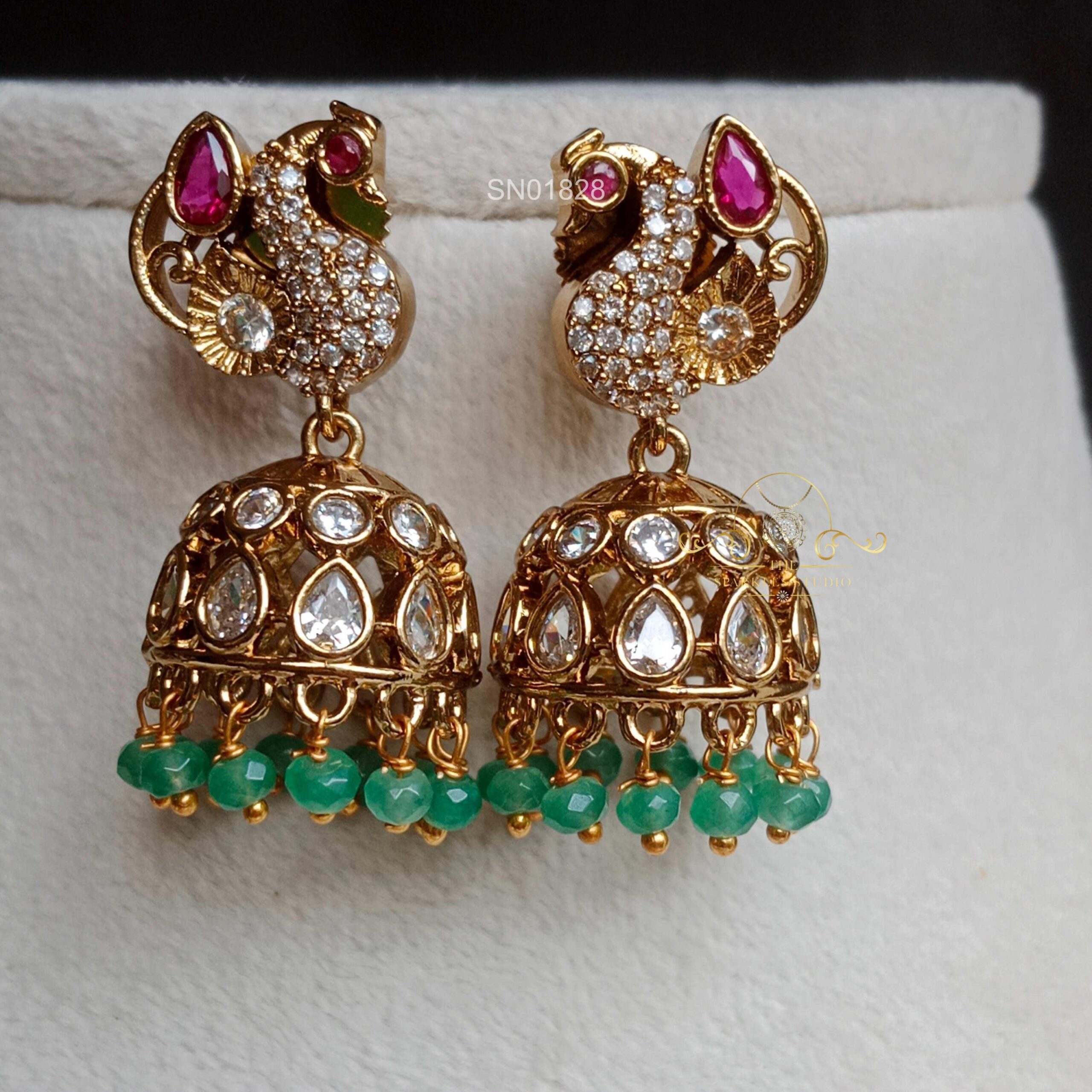 The bridal antique peacock bangles with Kemp stones are a spectacular and traditional accessory designed for special occasions. Adorned with intricate peacock motifs, these bangles showcase the beauty of antique craftsmanship.