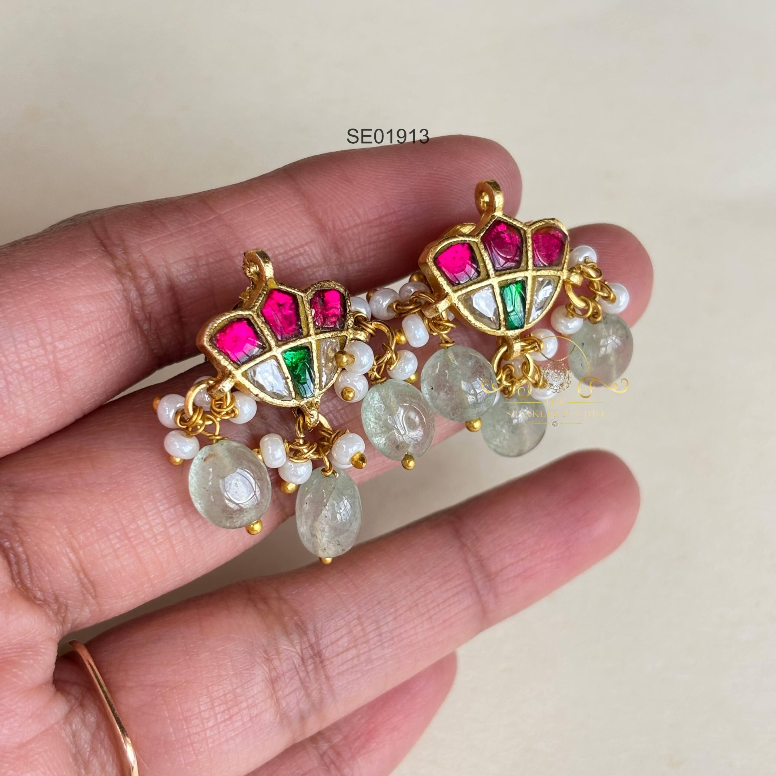 Small Jadau stud with green bead earrings crafted with intricate traditional detailing, featuring delicate kundan work and a charming pop of emerald colour. Perfect for subtle festive elegance and everyday ethnic styling.