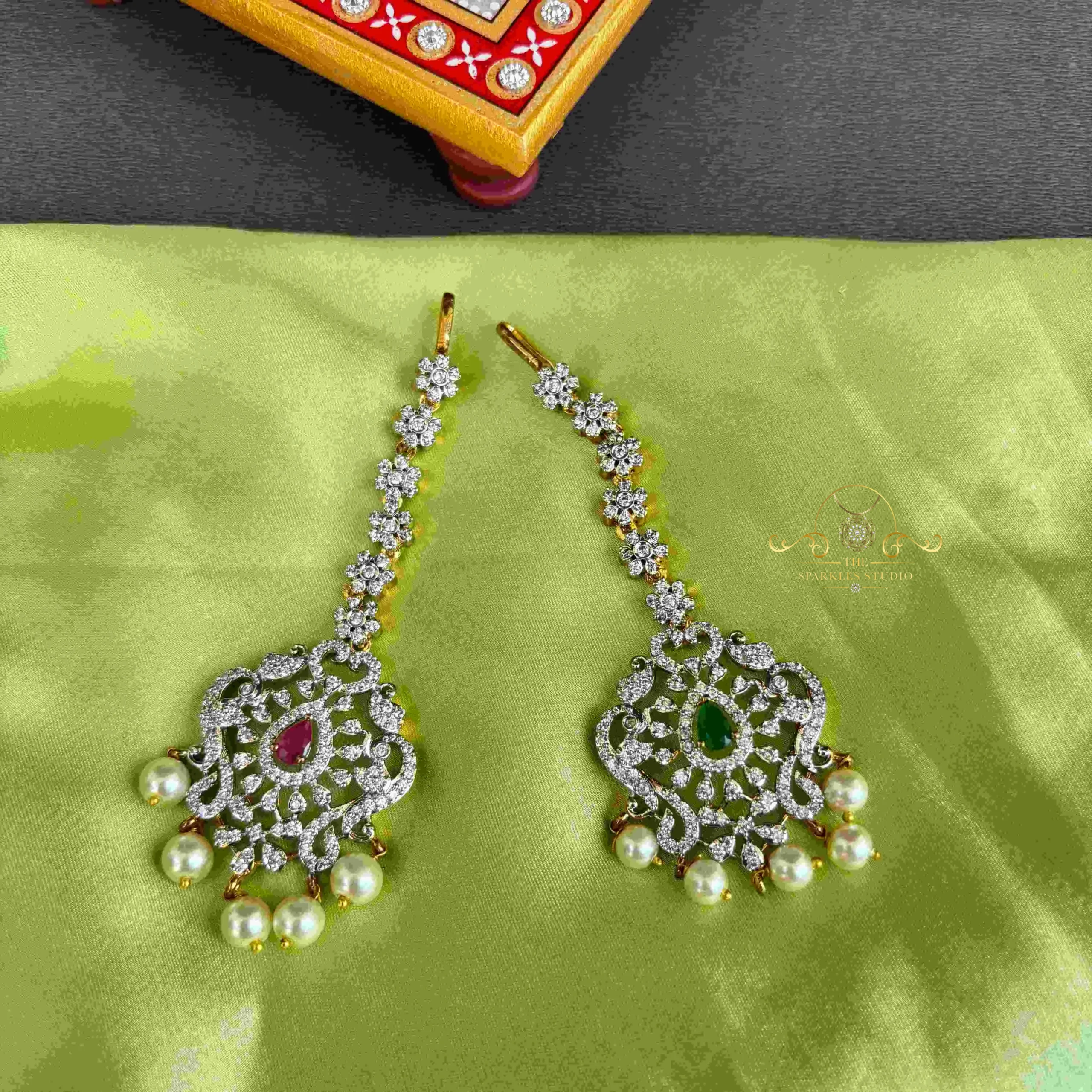 A sparkling American Diamond maang tikka, radiating elegance and charm, perfect for adding a touch of glamour to your bridal or festive ensemble.