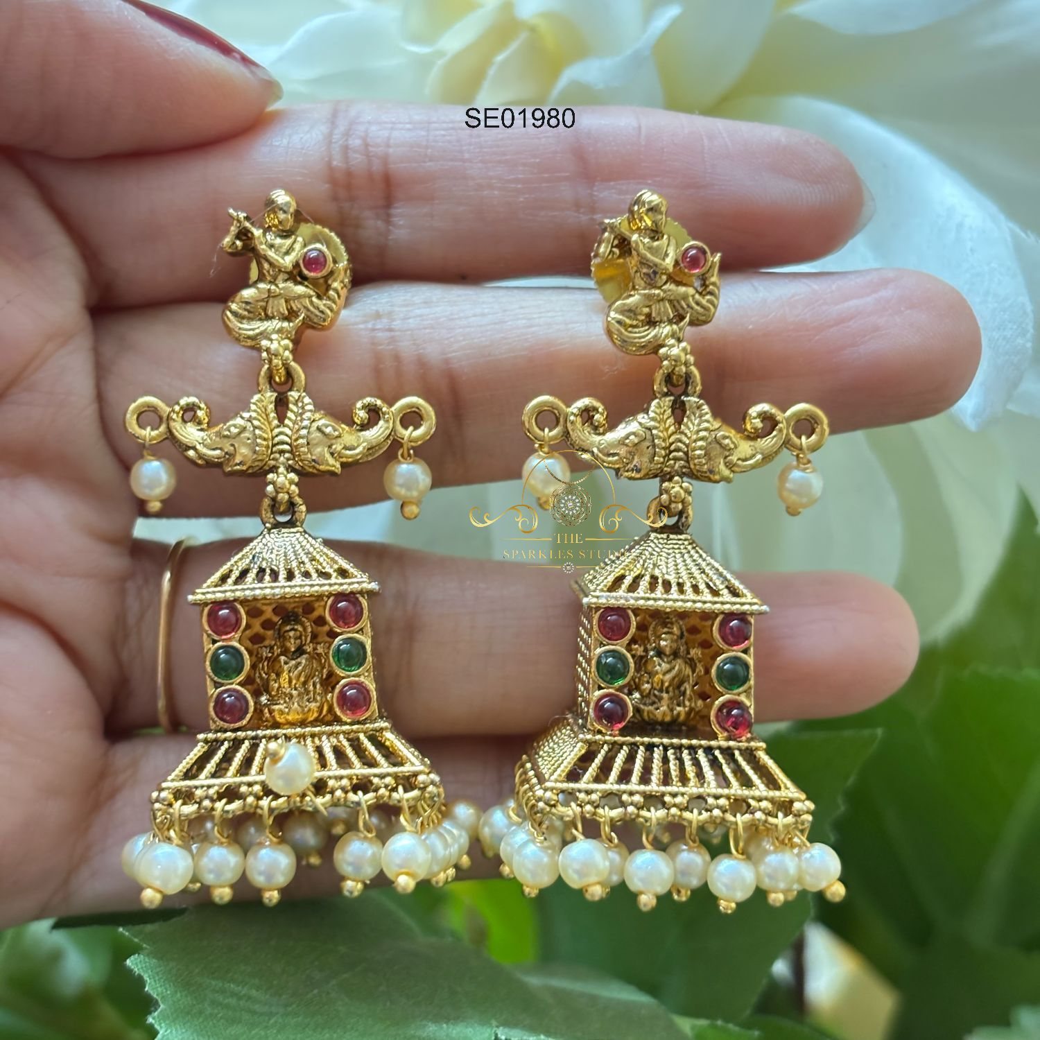 Adorn yourself with the regal charm of Elephant Studs featuring Emerald and White Stone Hanging with Pearl Drops. These intricately designed earrings combine the symbolism of elephants with the richness of emerald and white stones, creating a stunning accessory.