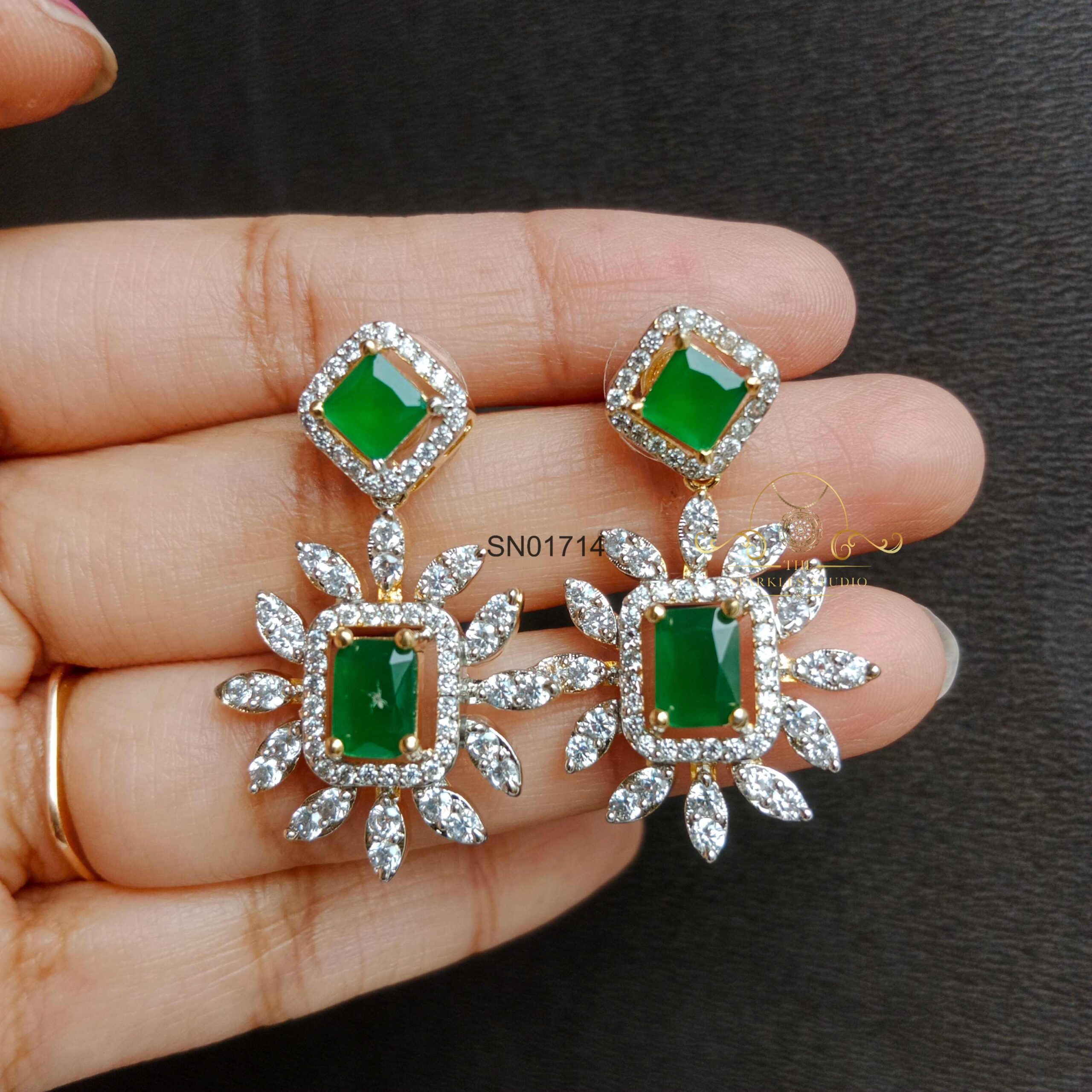 The Square and Flower AD Emerald Necklace Set combines dazzling American Diamonds with rich green emeralds in a unique geometric and floral design. Perfect for festive and wedding wear, it adds elegance and sophistication.