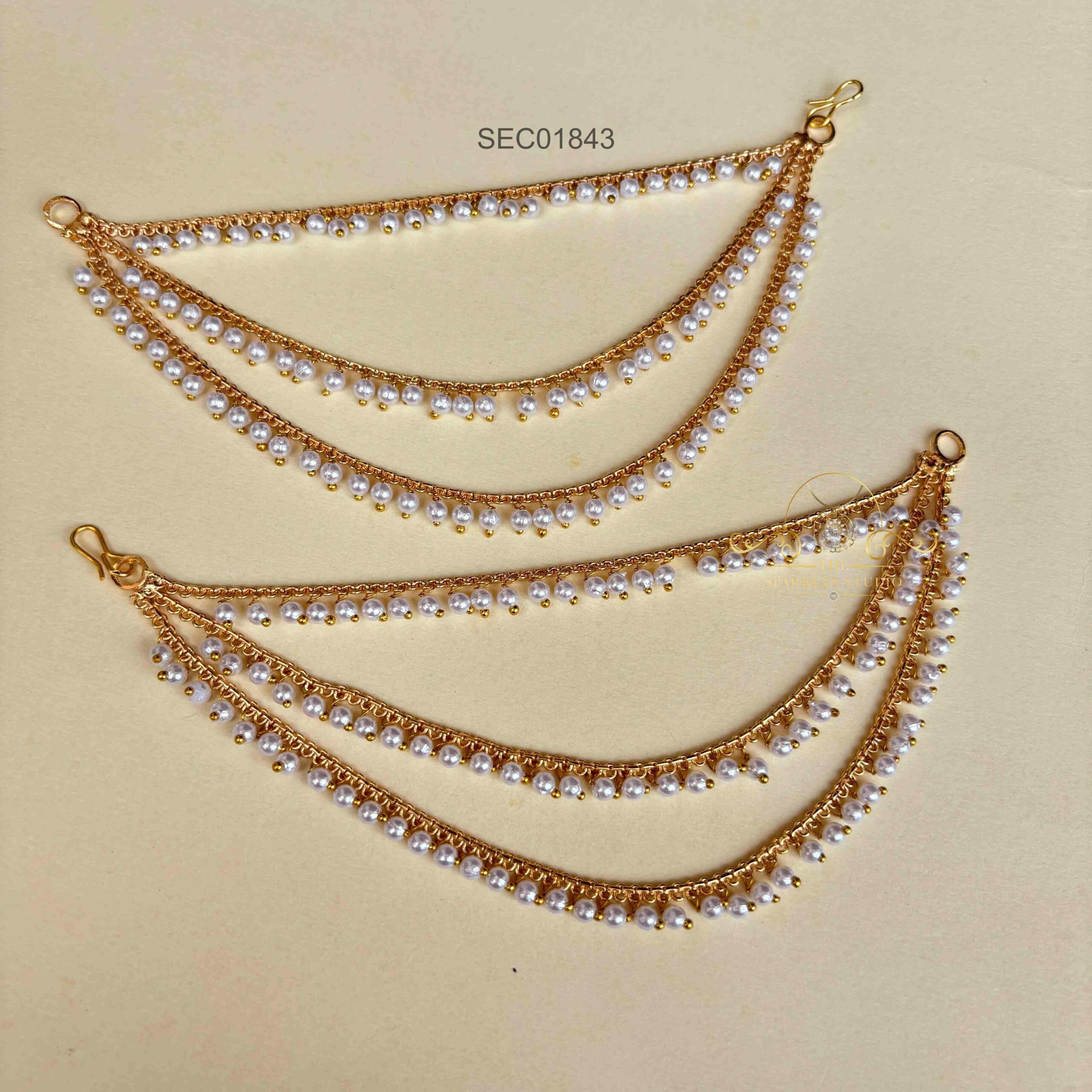 Elegant Three Layer Pearl Earchains featuring delicate pearl strands that add a graceful charm to any look. Perfect for weddings or festive wear, they beautifully complement traditional jhumkas or studs.