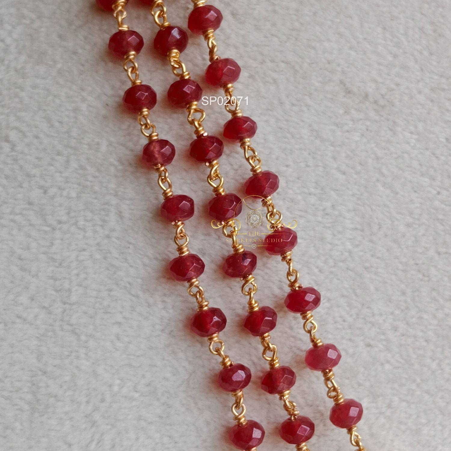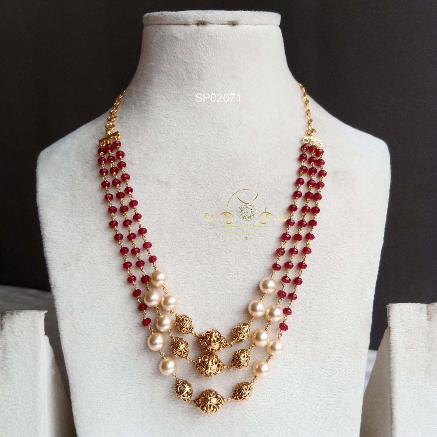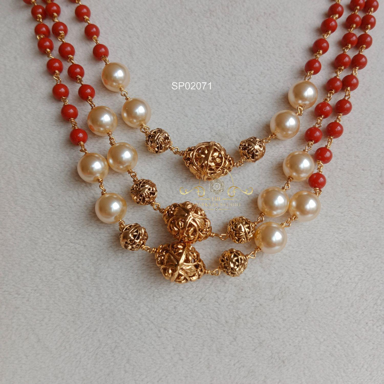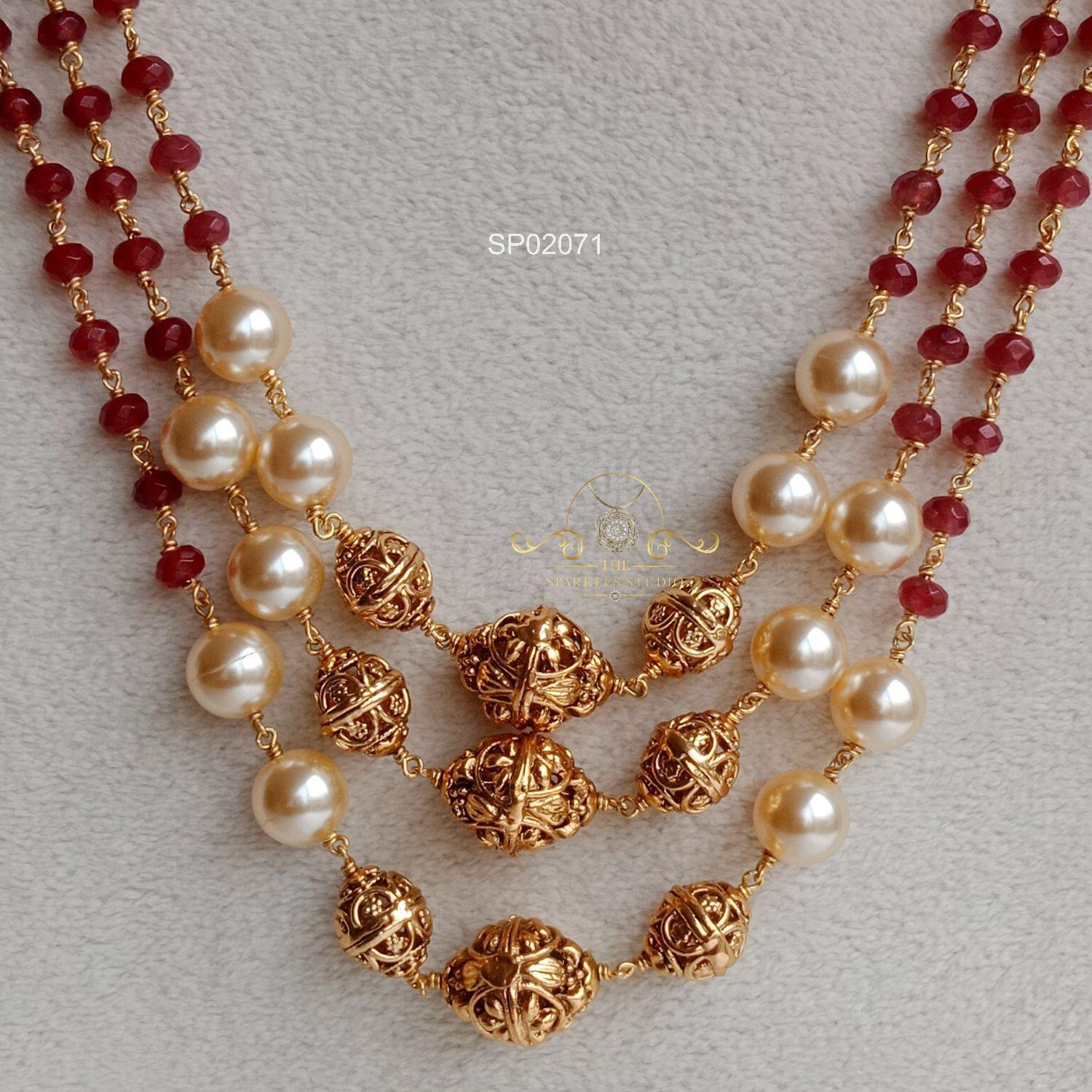 Elegant Three Line Bead and Pearl Mala featuring layered beads and lustrous pearls, creating a rich traditional look perfect for weddings, festive occasions, and graceful styling with sarees and ethnic outfits.