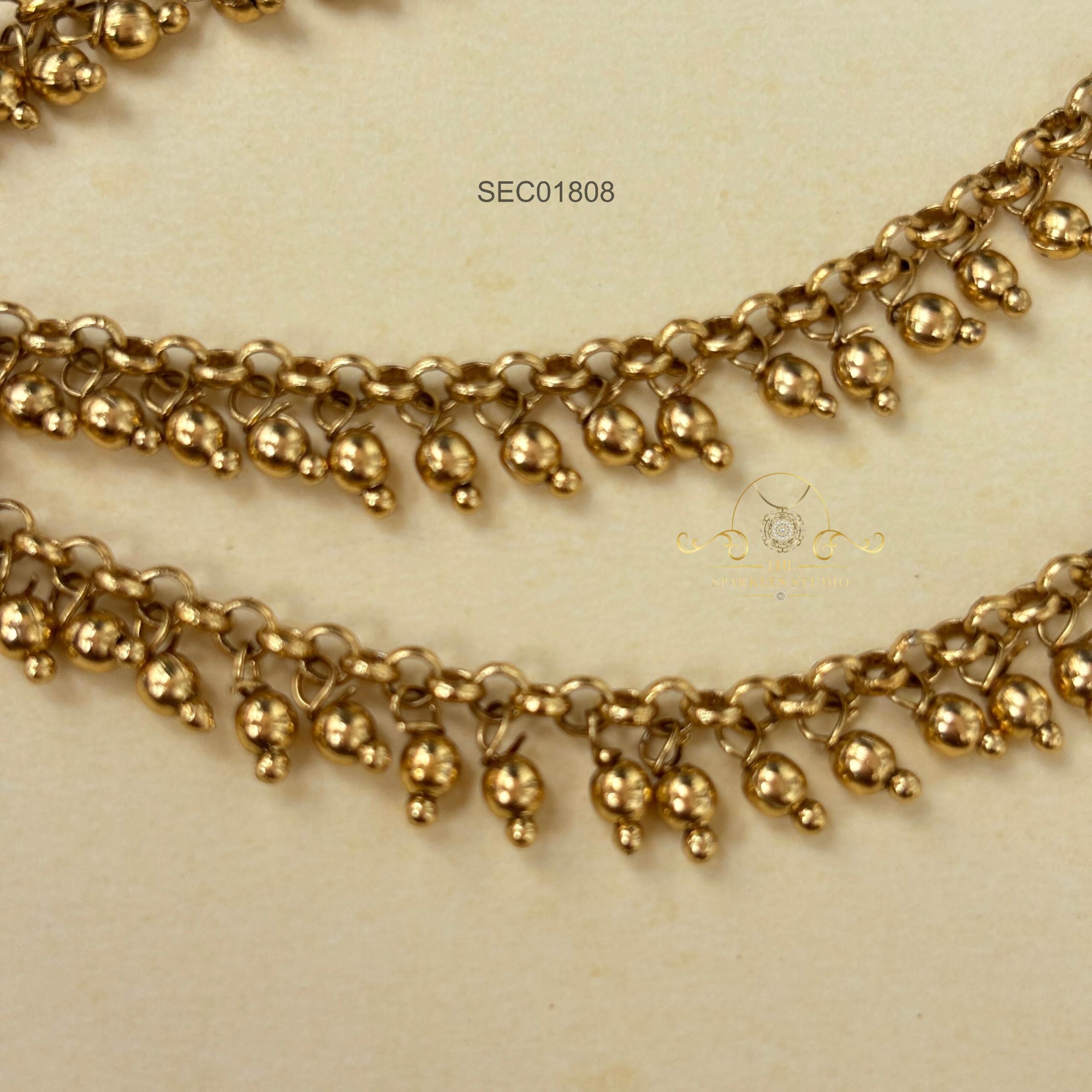This Three Line Gold Beads Earchain features delicate golden beads arranged in triple strands for a graceful drape. Perfect for pairing with jhumkas or studs, it enhances bridal and festive looks beautifully.