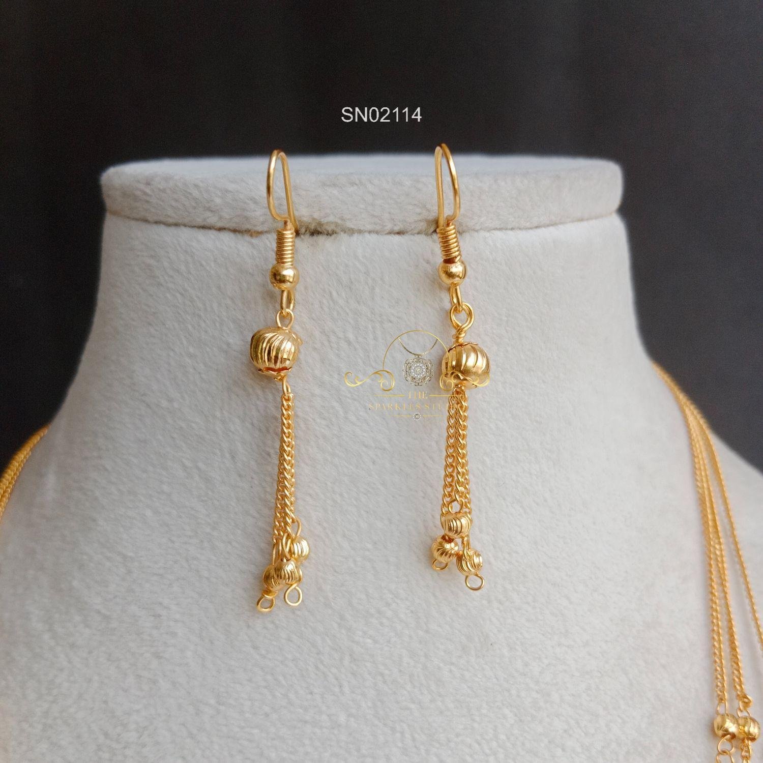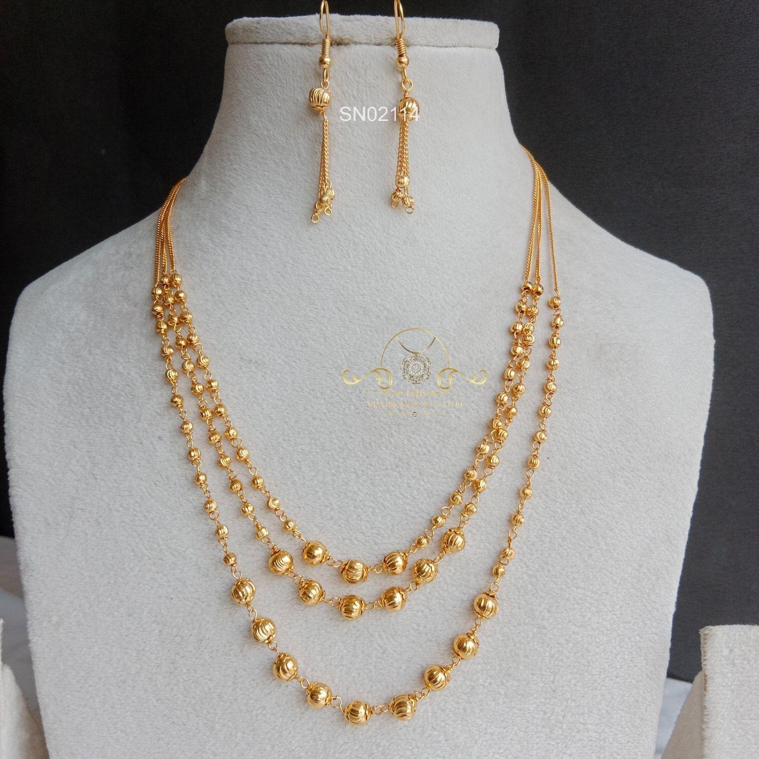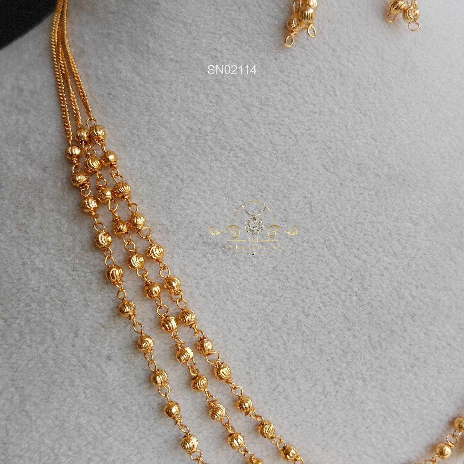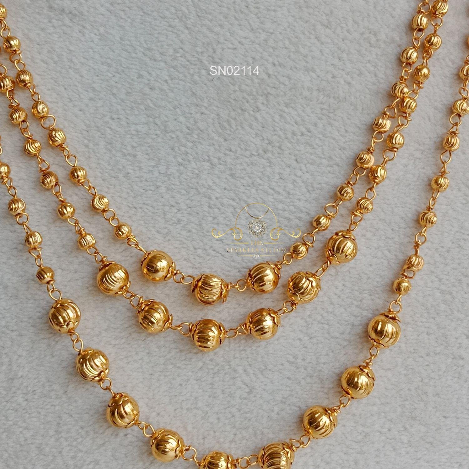 Three line gold beads necklace features layered strands of polished gold beads, creating a rich, textured look that feels traditional yet versatile, adding subtle festive elegance to everyday and occasion wear.