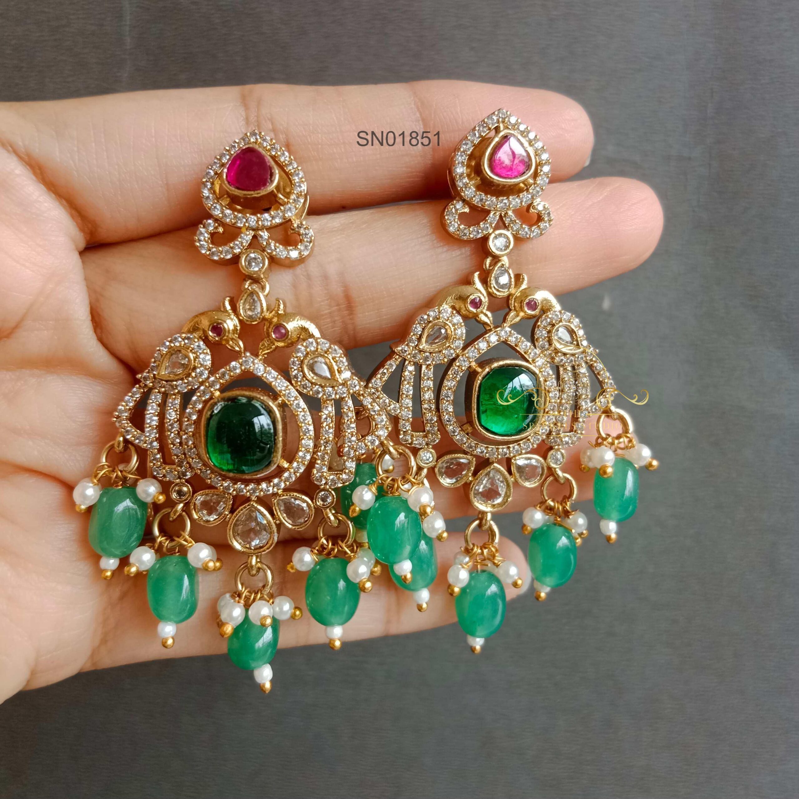 Green Stone Lakshmi Jhumkis are traditional Indian earrings inspired by the Hindu goddess Lakshmi. These jhumkis typically feature intricate designs with green stones, often emerald or other green gemstones, representing prosperity and wealth.