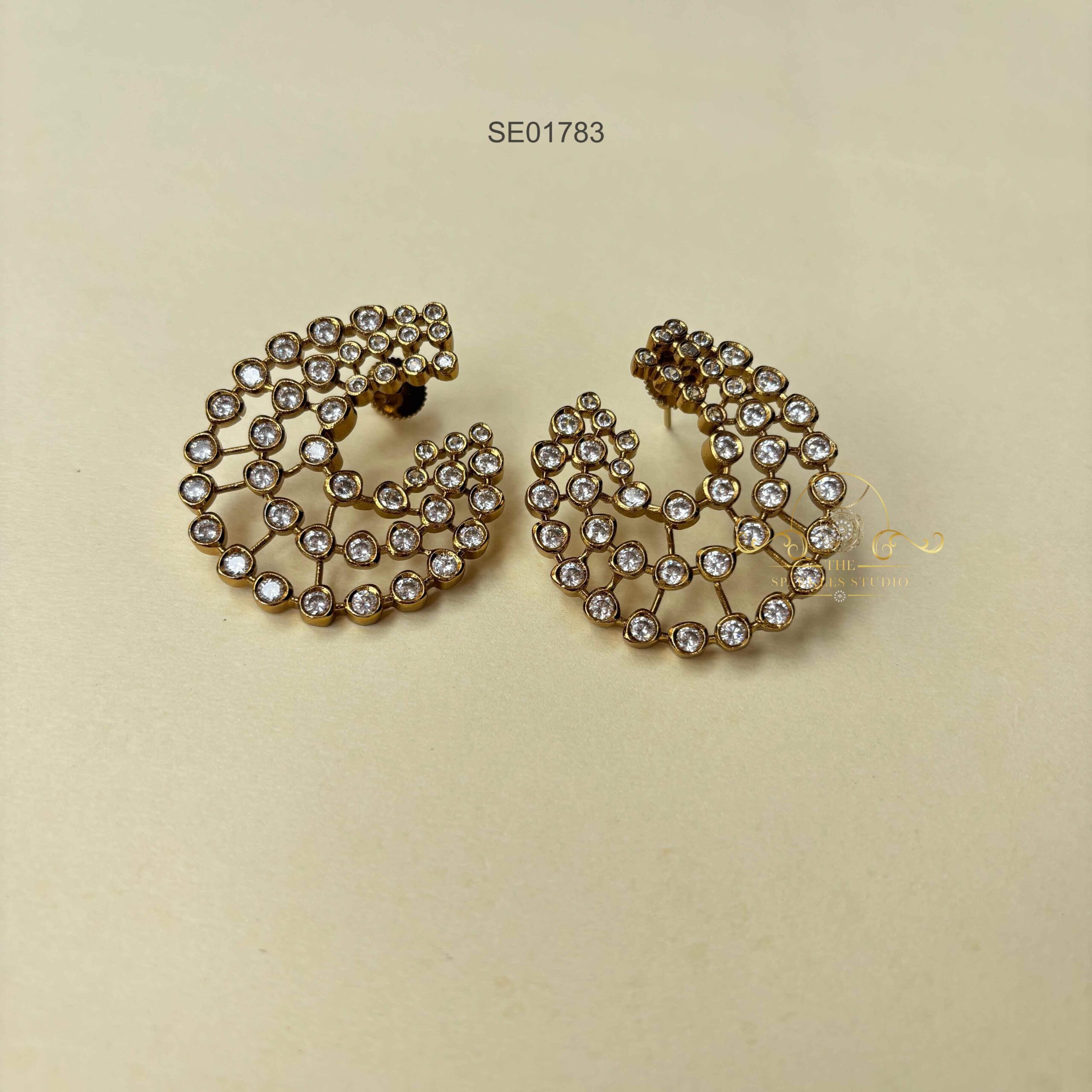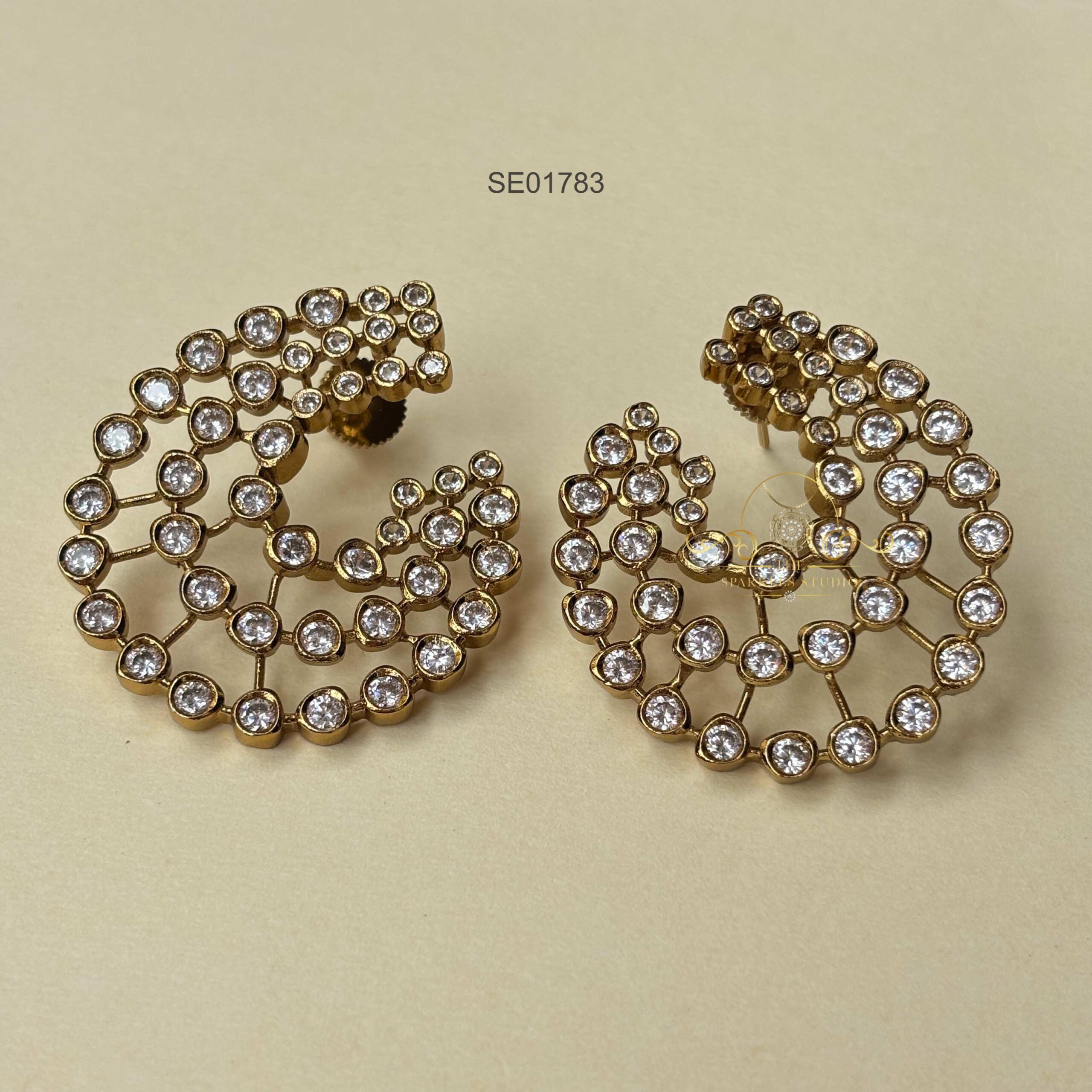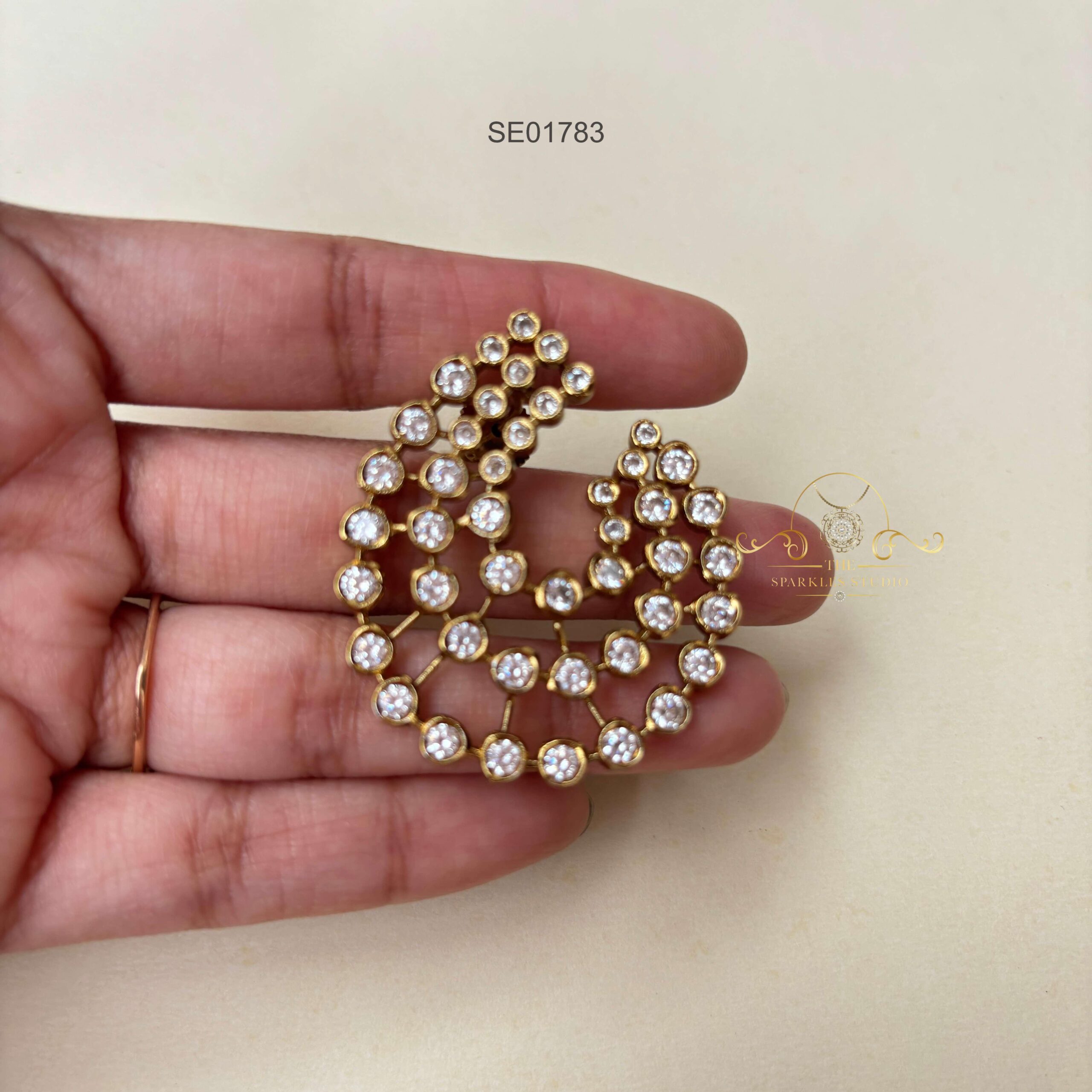 The Three Stylish C AD Earrings feature a chic triple-C design studded with sparkling AD stones. Elegant yet modern, they’re perfect for adding a glamorous edge to both traditional and western outfits.