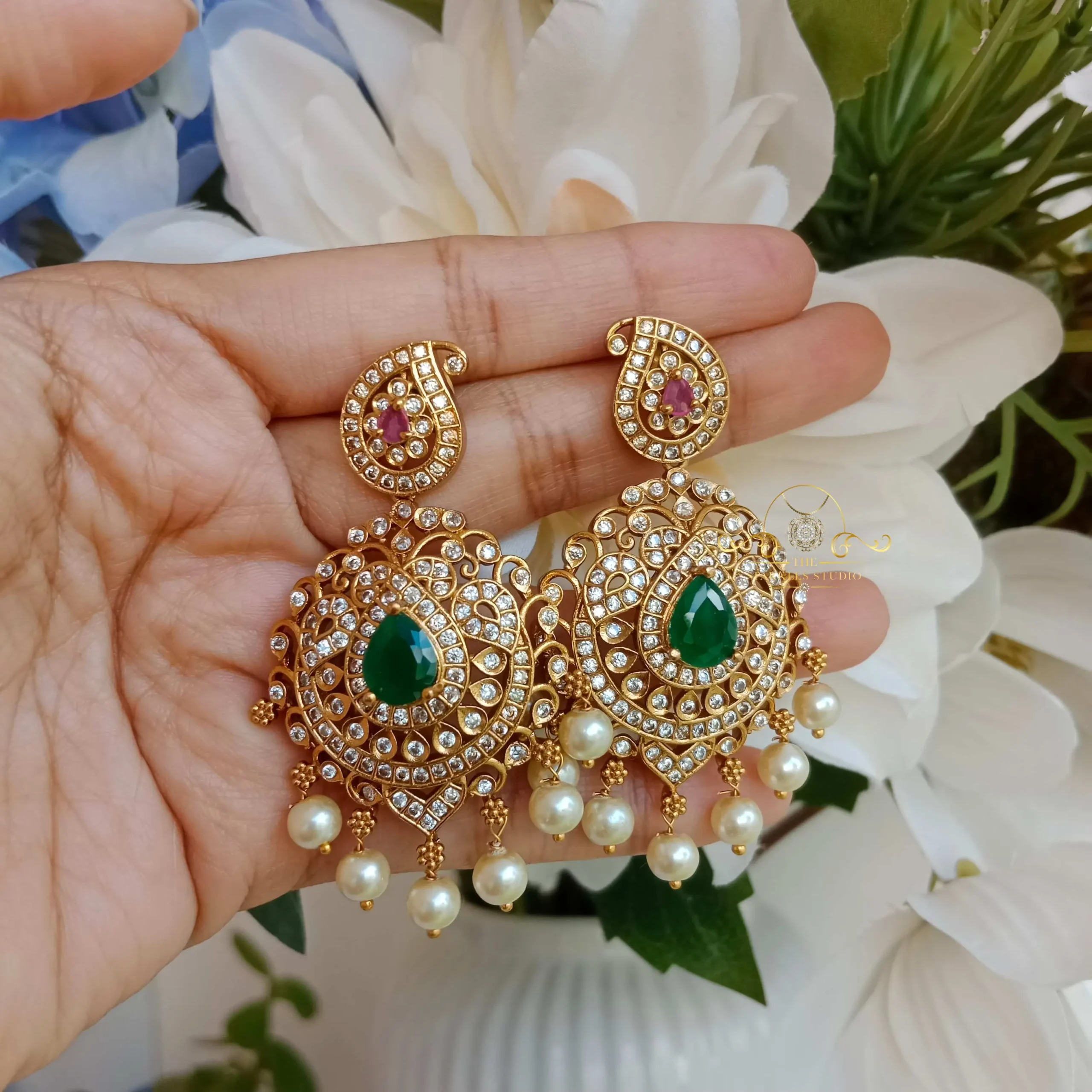 Green Stone Lakshmi Jhumkis are traditional Indian earrings inspired by the Hindu goddess Lakshmi. These jhumkis typically feature intricate designs with green stones, often emerald or other green gemstones, representing prosperity and wealth.
