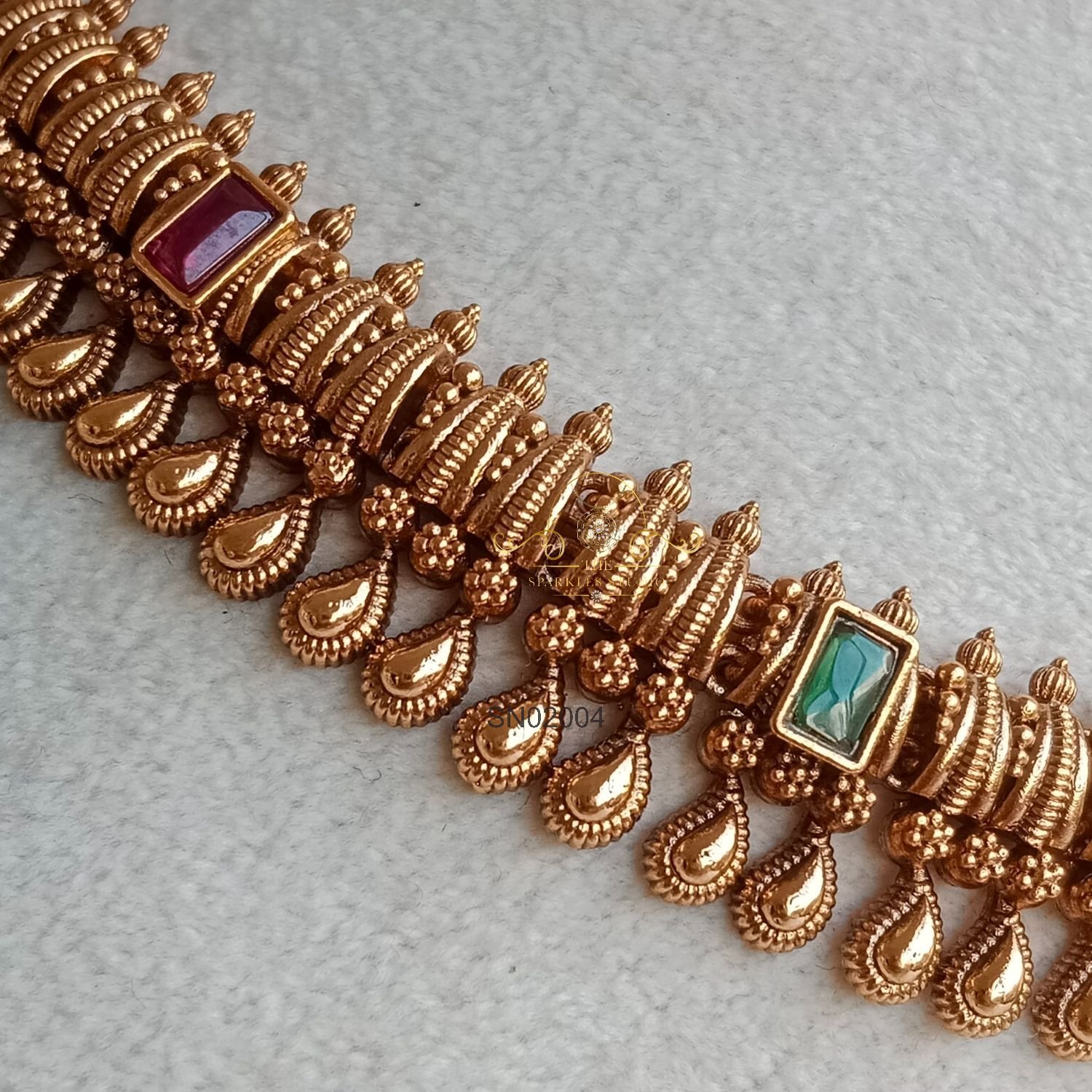 The Trendy Antique Necklace features traditional motifs with a modern antique finish, creating a stylish fusion look—perfect for festive occasions and elevating sarees, lehengas, or contemporary ethnic outfits.