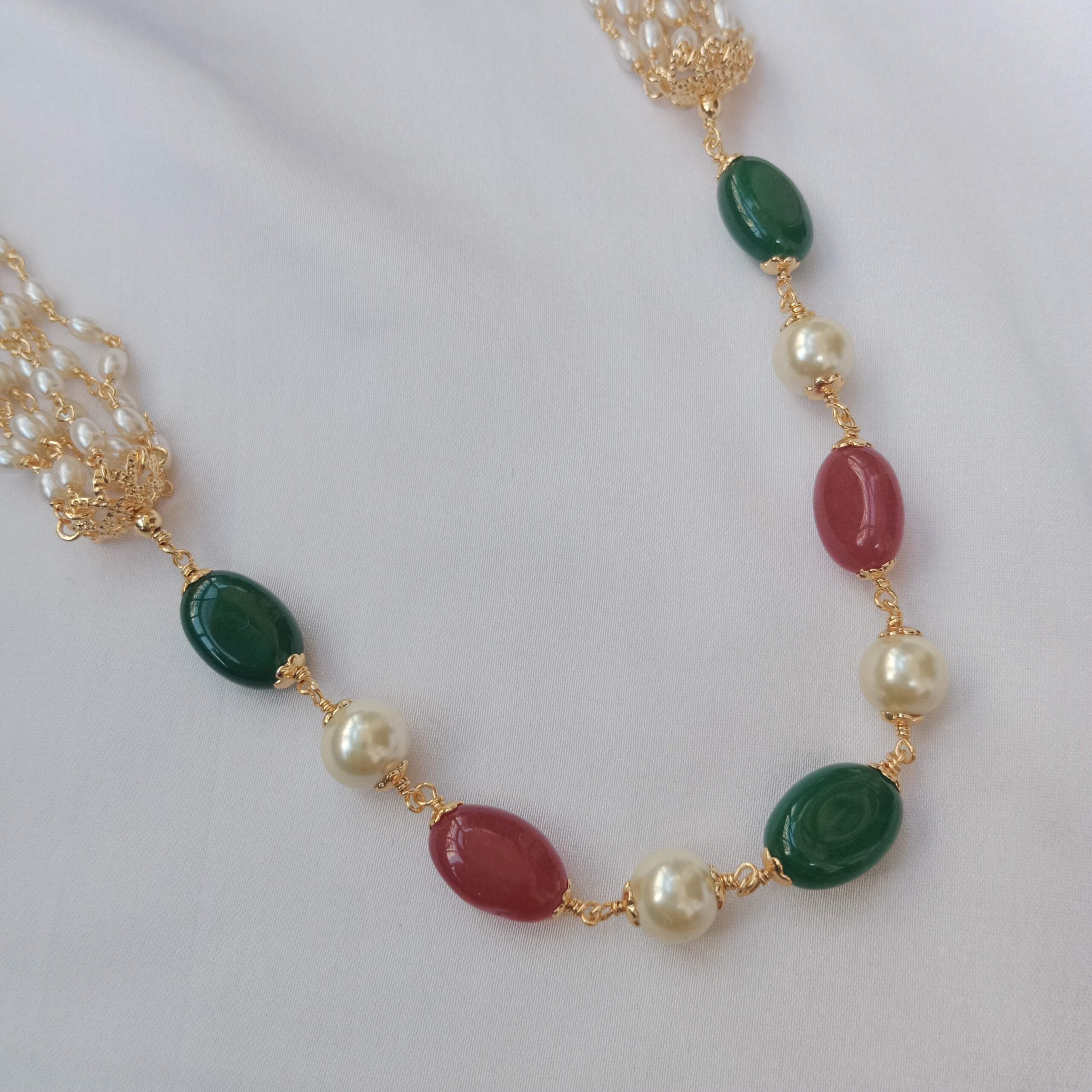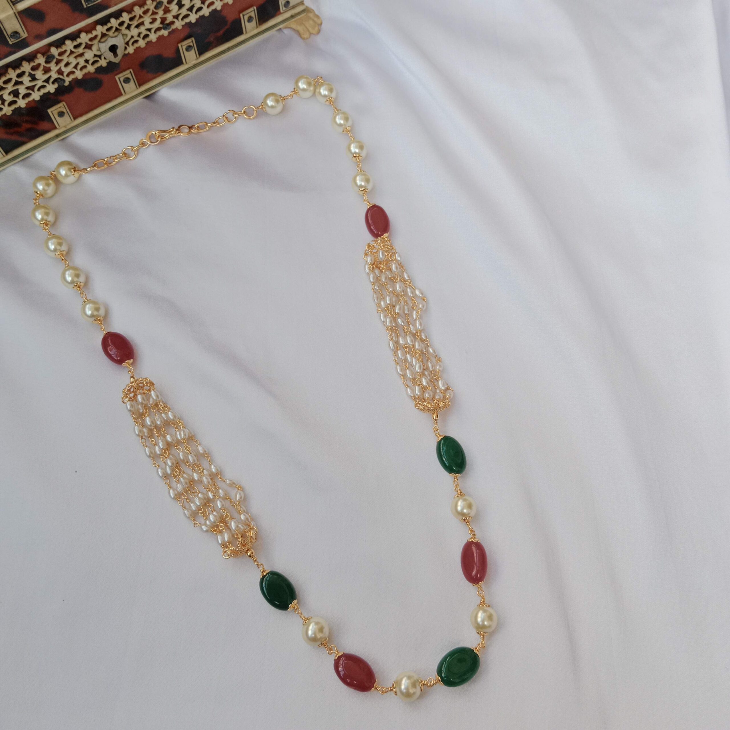 The trendy pearl chain with red and green beads is a fashionable and eye-catching accessory. Adorned with lustrous pearls and vibrant red and green beads, this chain combines classic elegance with a trendy flair. The mix of pearls and colorful beads creates a stylish contrast, making it a versatile piece that can add a pop of color to any outfit. This trendy pearl chain is a perfect choice for those who want a chic and modern look.