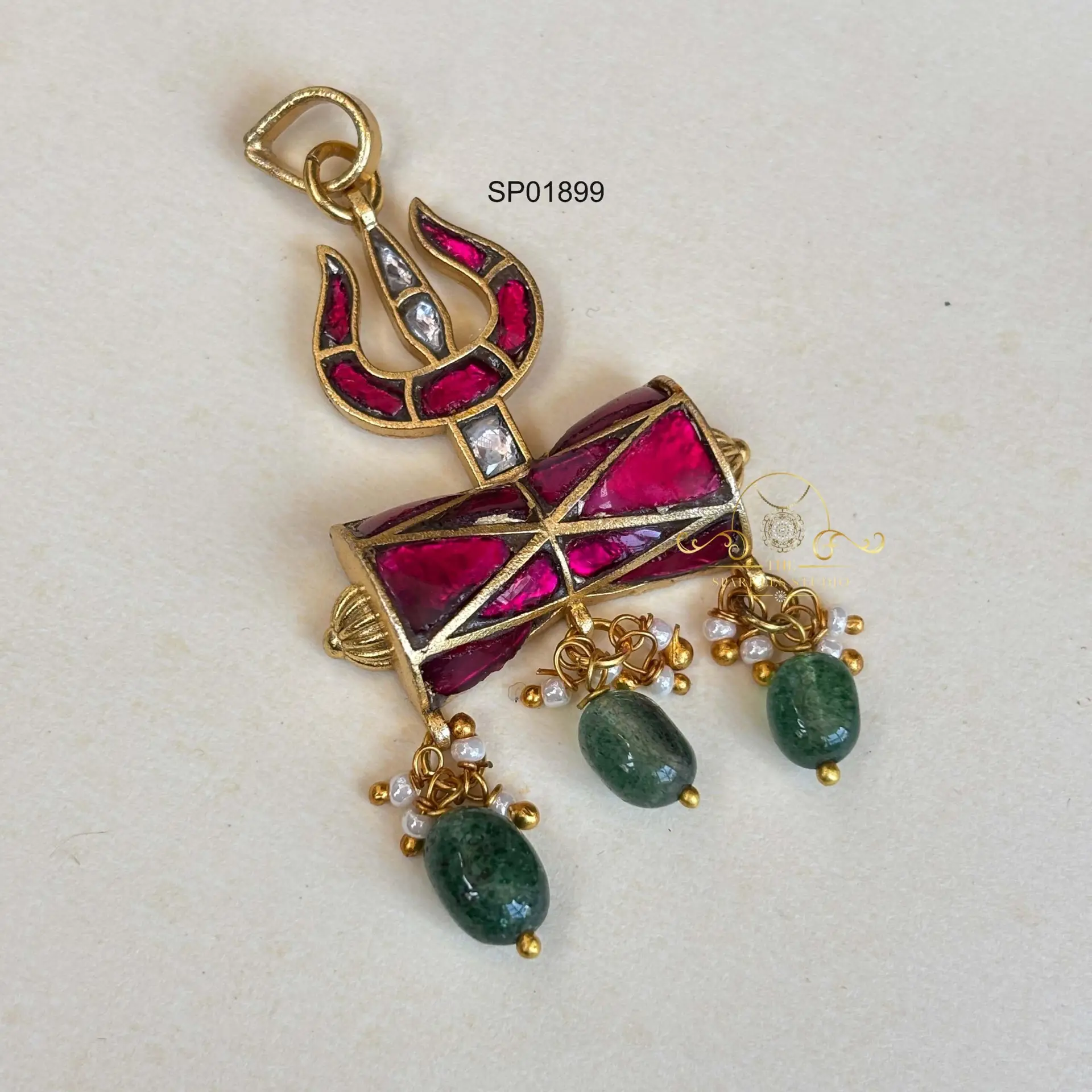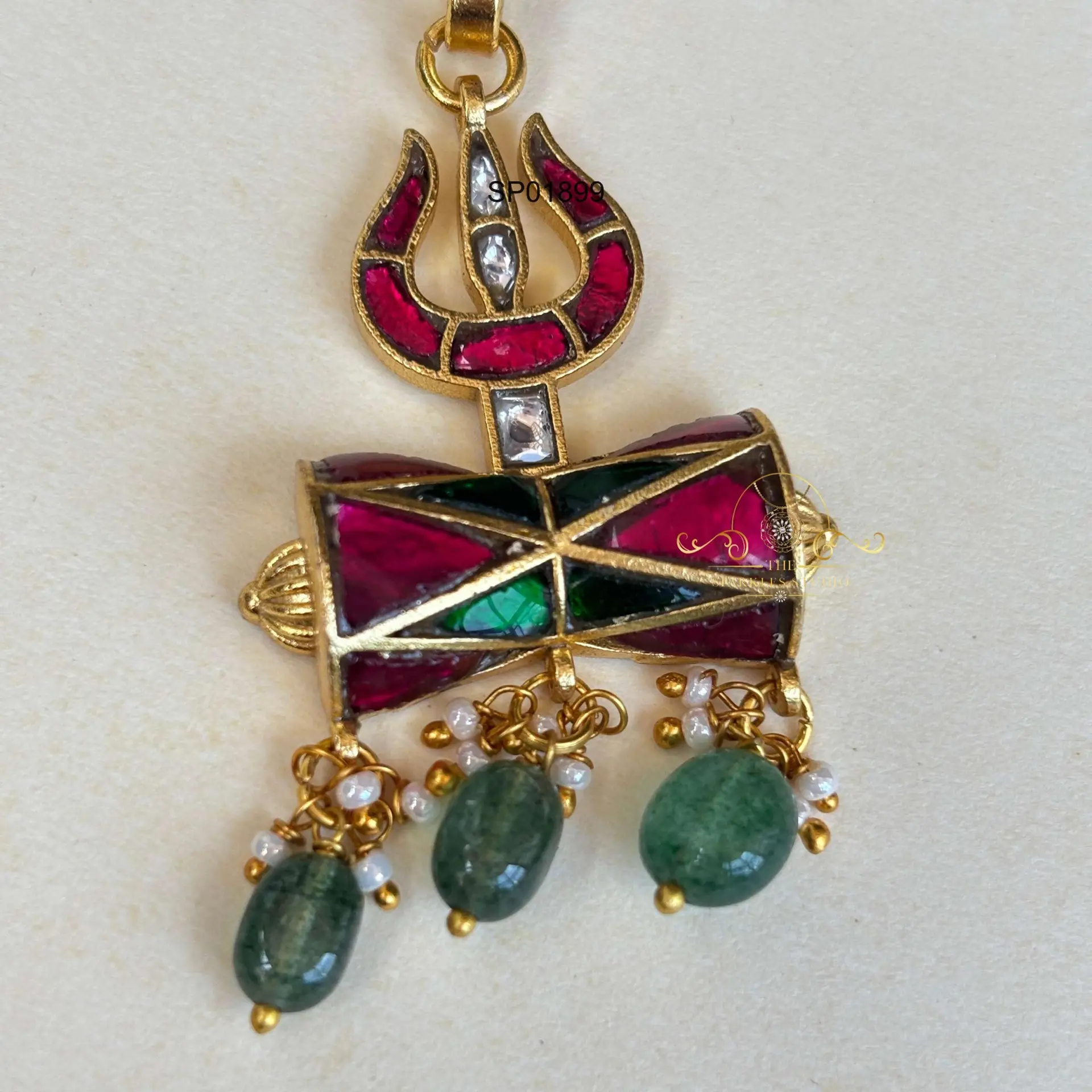 Trishul jadau pendant featuring intricate hand-set stones and divine Trishul motif. Perfect for spiritual, festive, and traditional looks, adding sacred symbolism, regal heritage charm, and powerful cultural elegance.