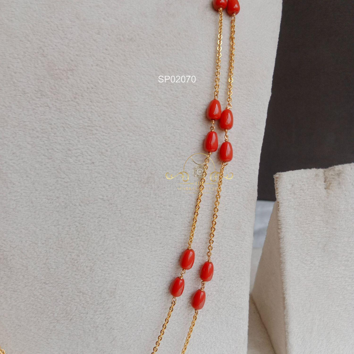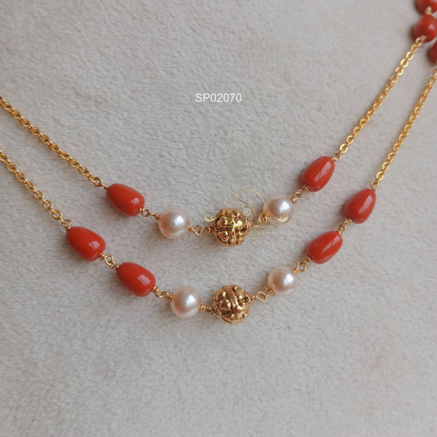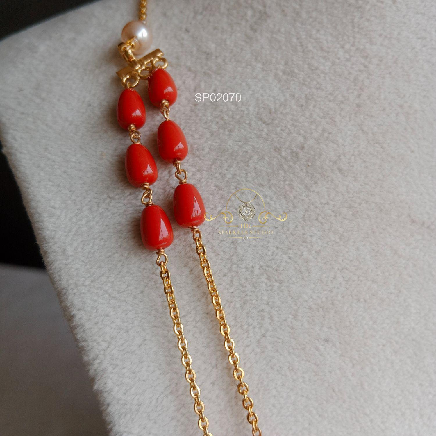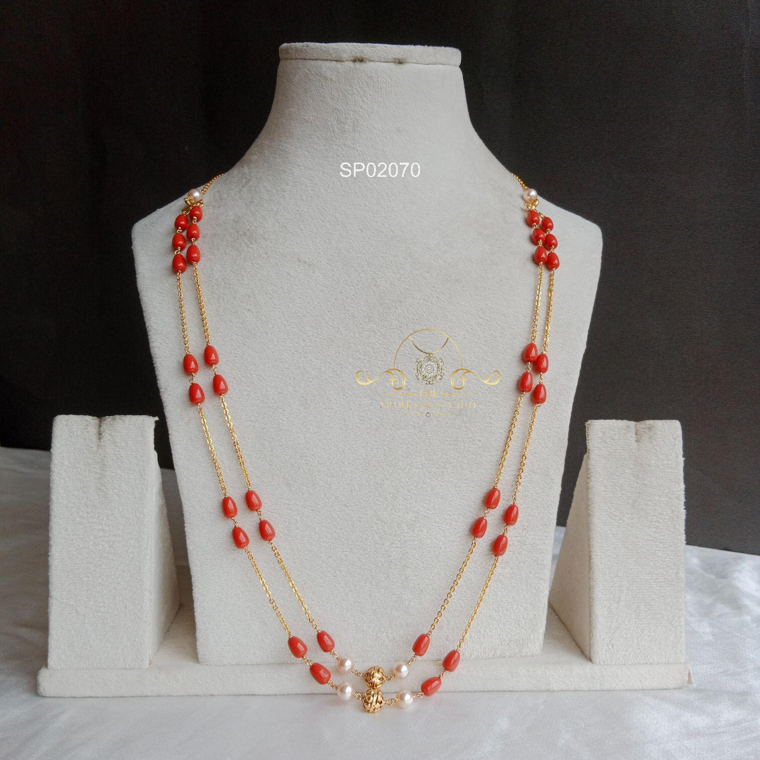 Elegant Two Line Pearl and Coral Chain featuring delicate pearls paired with vibrant coral beads, layered beautifully to create a graceful traditional look perfect for festive occasions, sarees, and ethnic outfits.