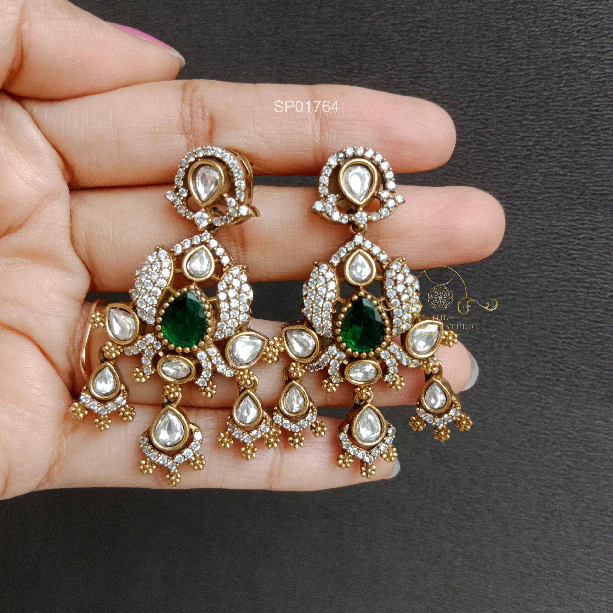 Green Stone Lakshmi Jhumkis are traditional Indian earrings inspired by the Hindu goddess Lakshmi. These jhumkis typically feature intricate designs with green stones, often emerald or other green gemstones, representing prosperity and wealth.