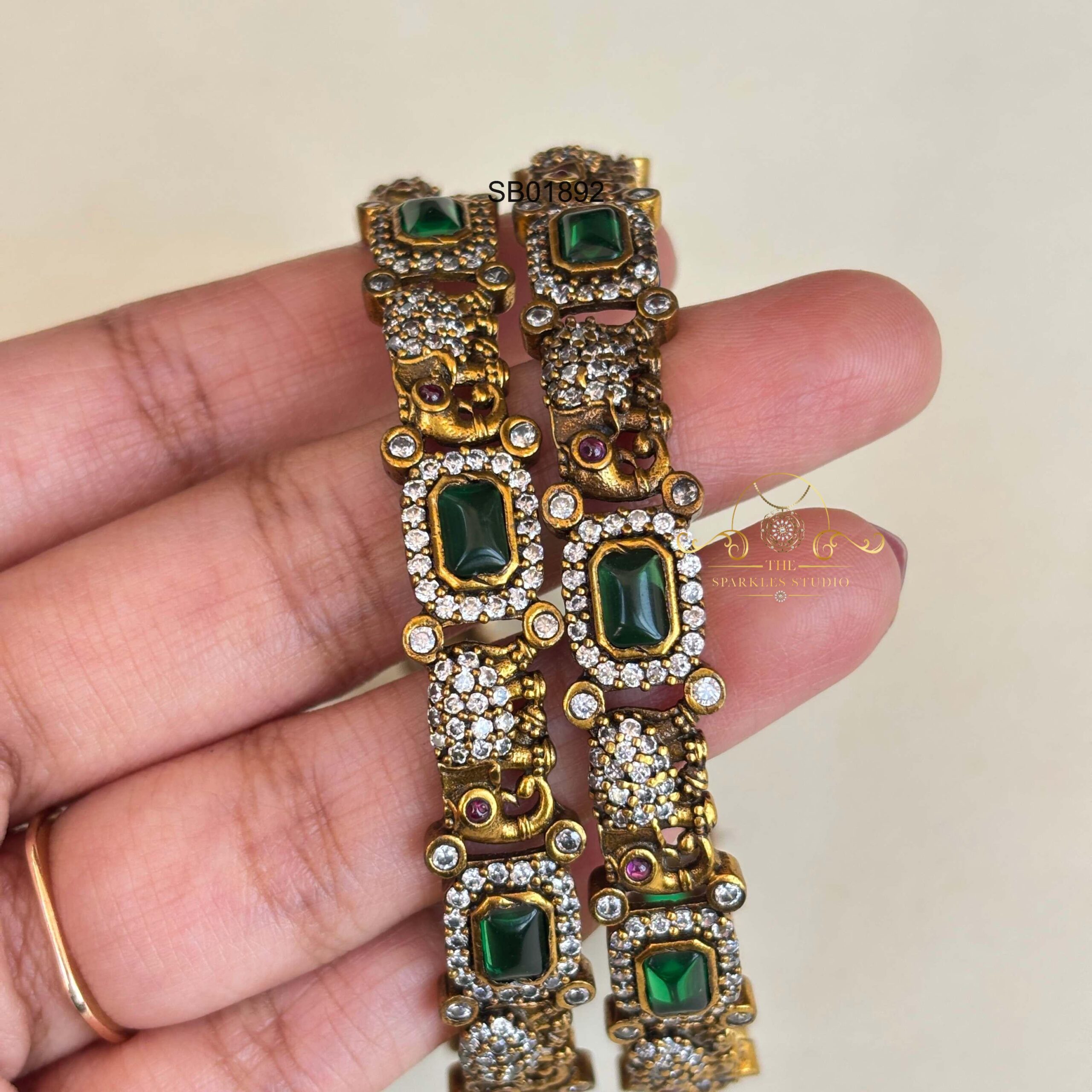 Victorian ruby/emerald bangles featuring antique finish, intricate detailing, and rich gemstone accents. Perfect for weddings and festive wear, adding regal elegance, heritage charm, and a timeless royal touch to your traditional look.