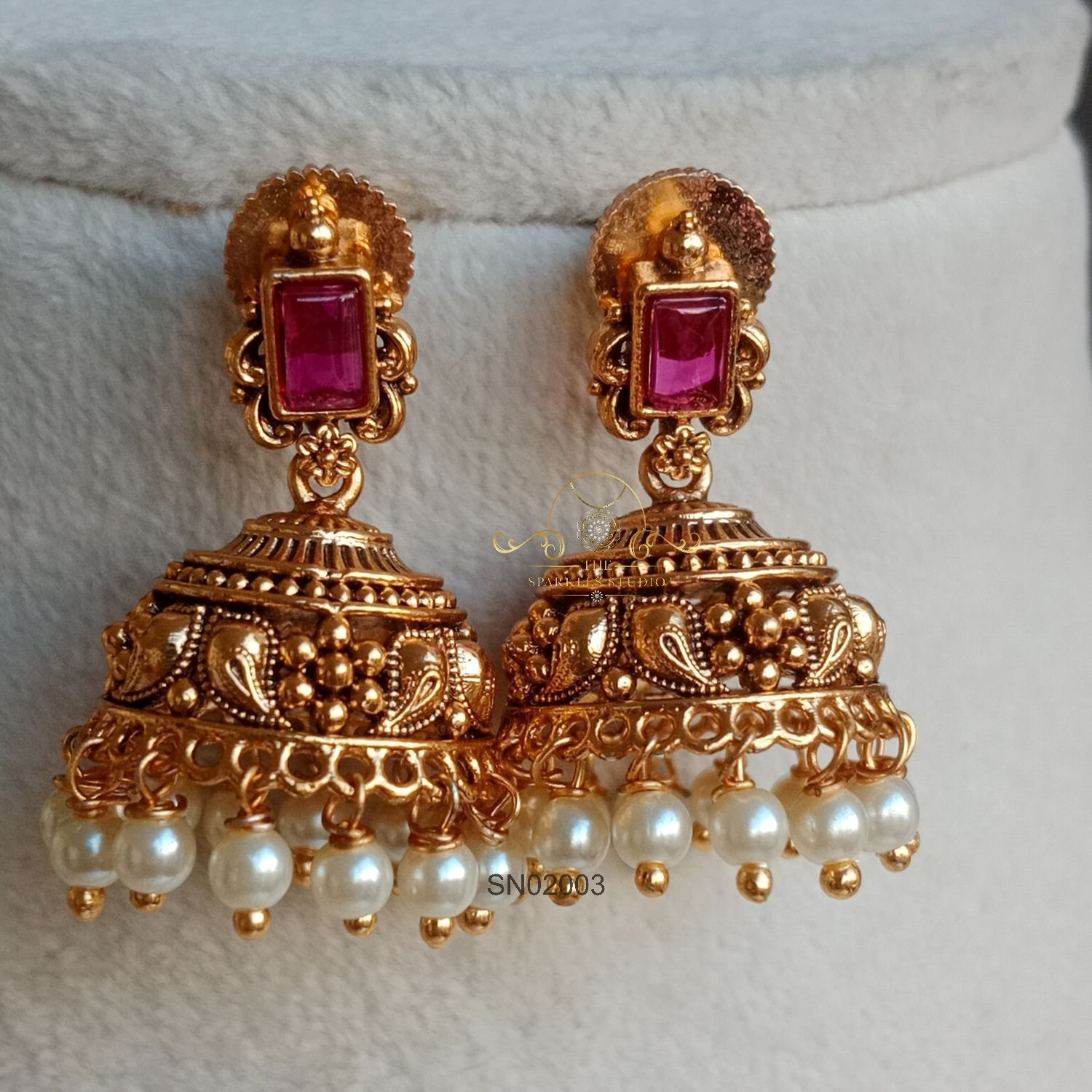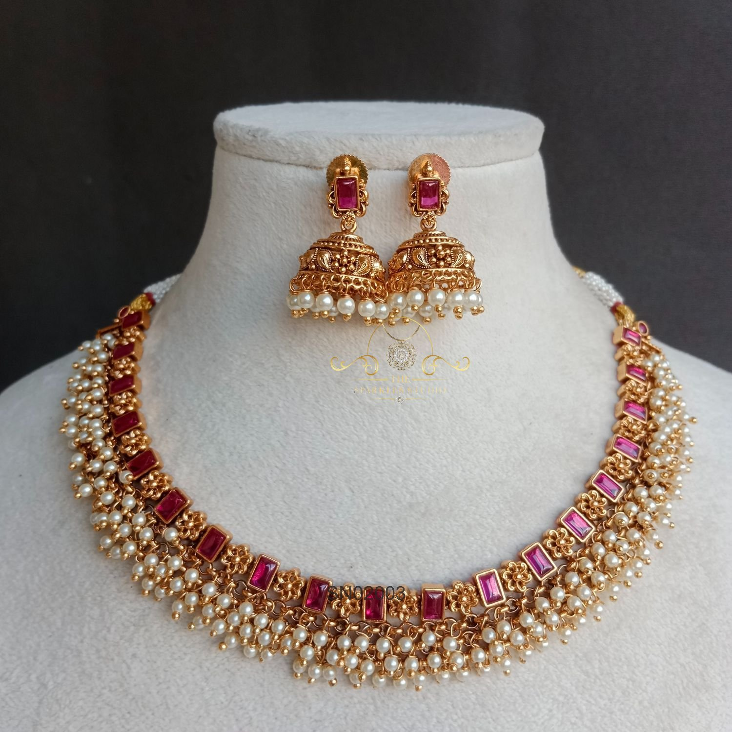 The Vintage Ruby Pearl Set blends rich ruby tones with soft pearls in a classic vintage design, offering timeless elegance—perfect for weddings, festive occasions, and pairing with silk sarees or heirloom-inspired outfits.