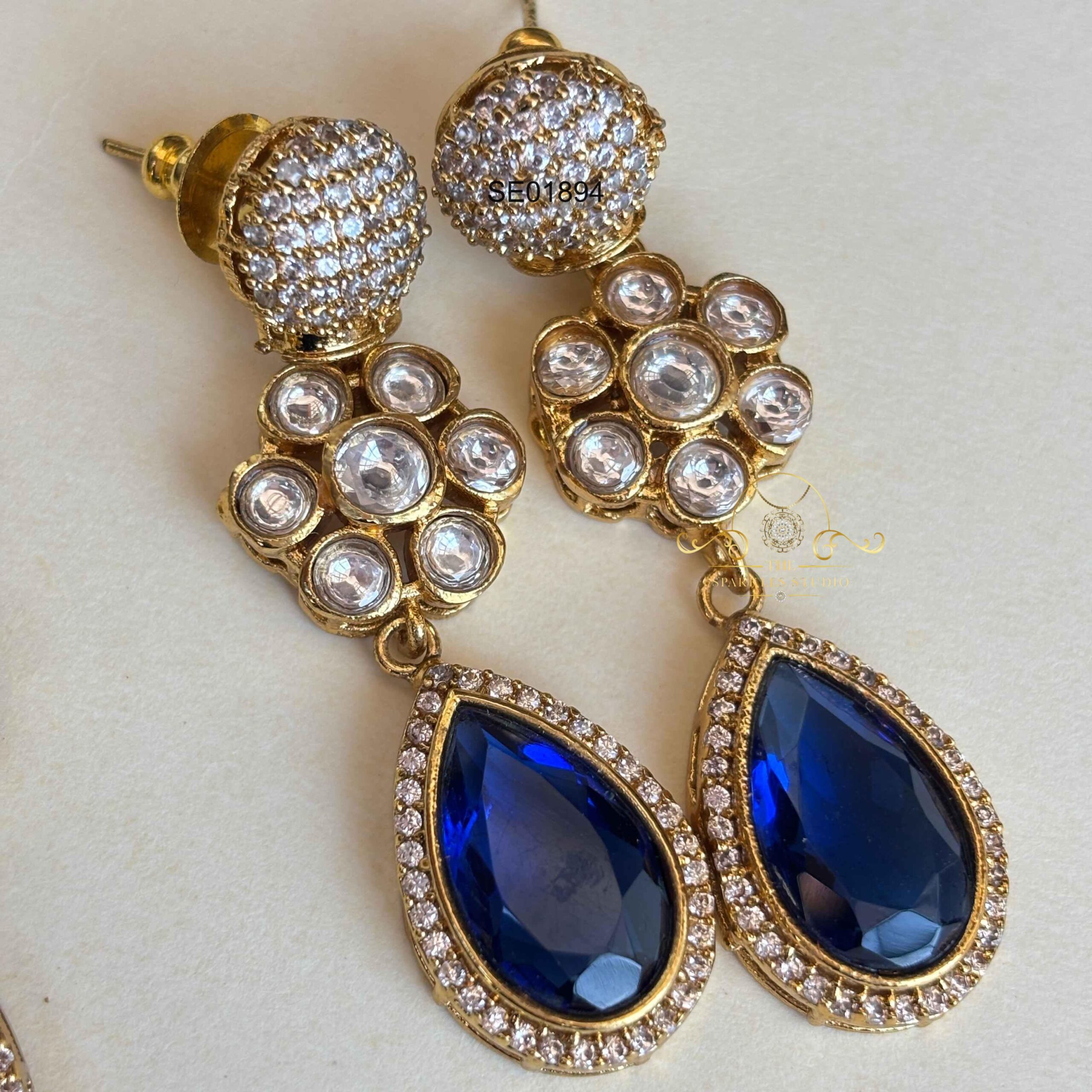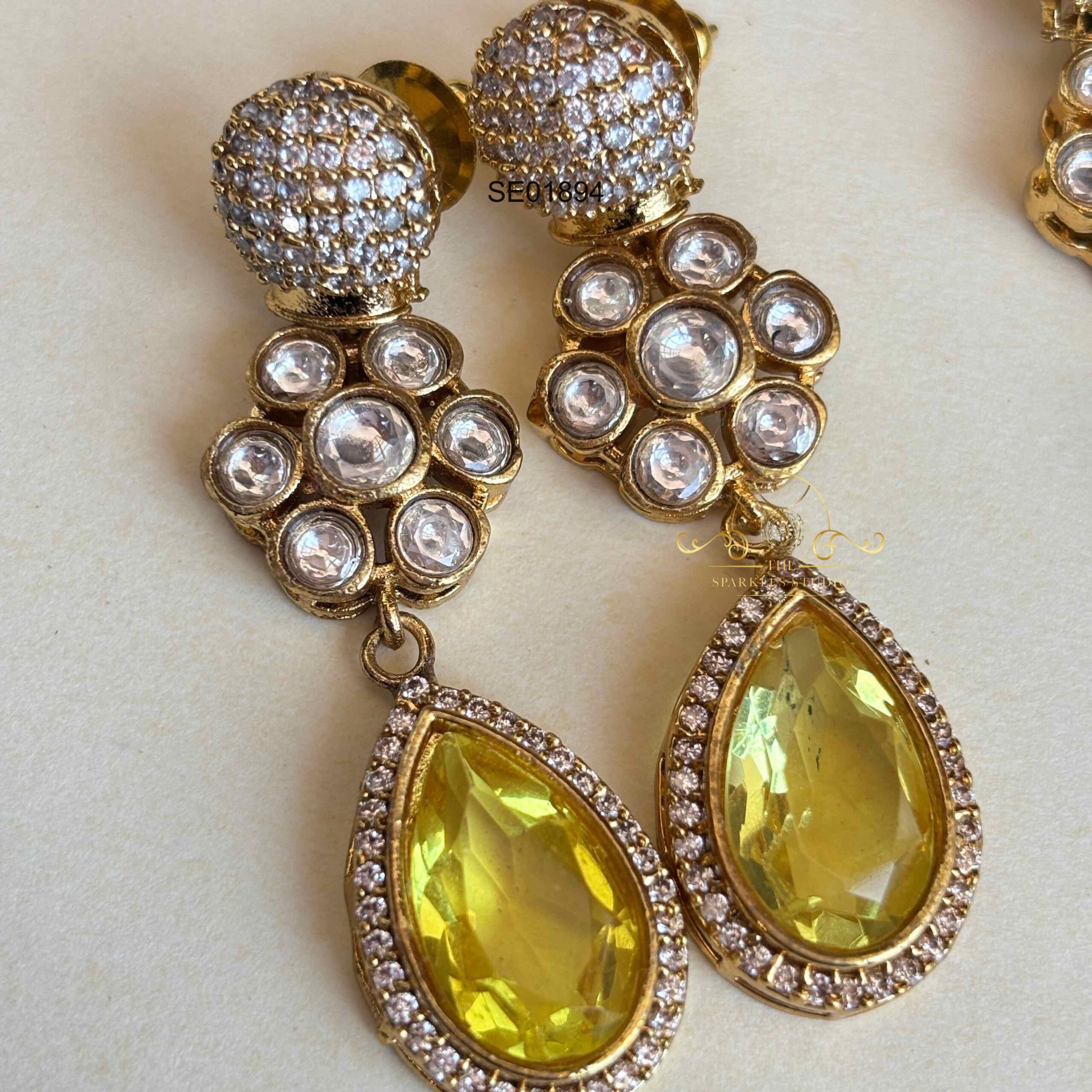 Yellow/Blue stone AD earrings featuring sparkling stones in vibrant contrasting shades. Perfect for festive and party looks, adding playful color, elegant shine, and a chic statement touch to your style.
